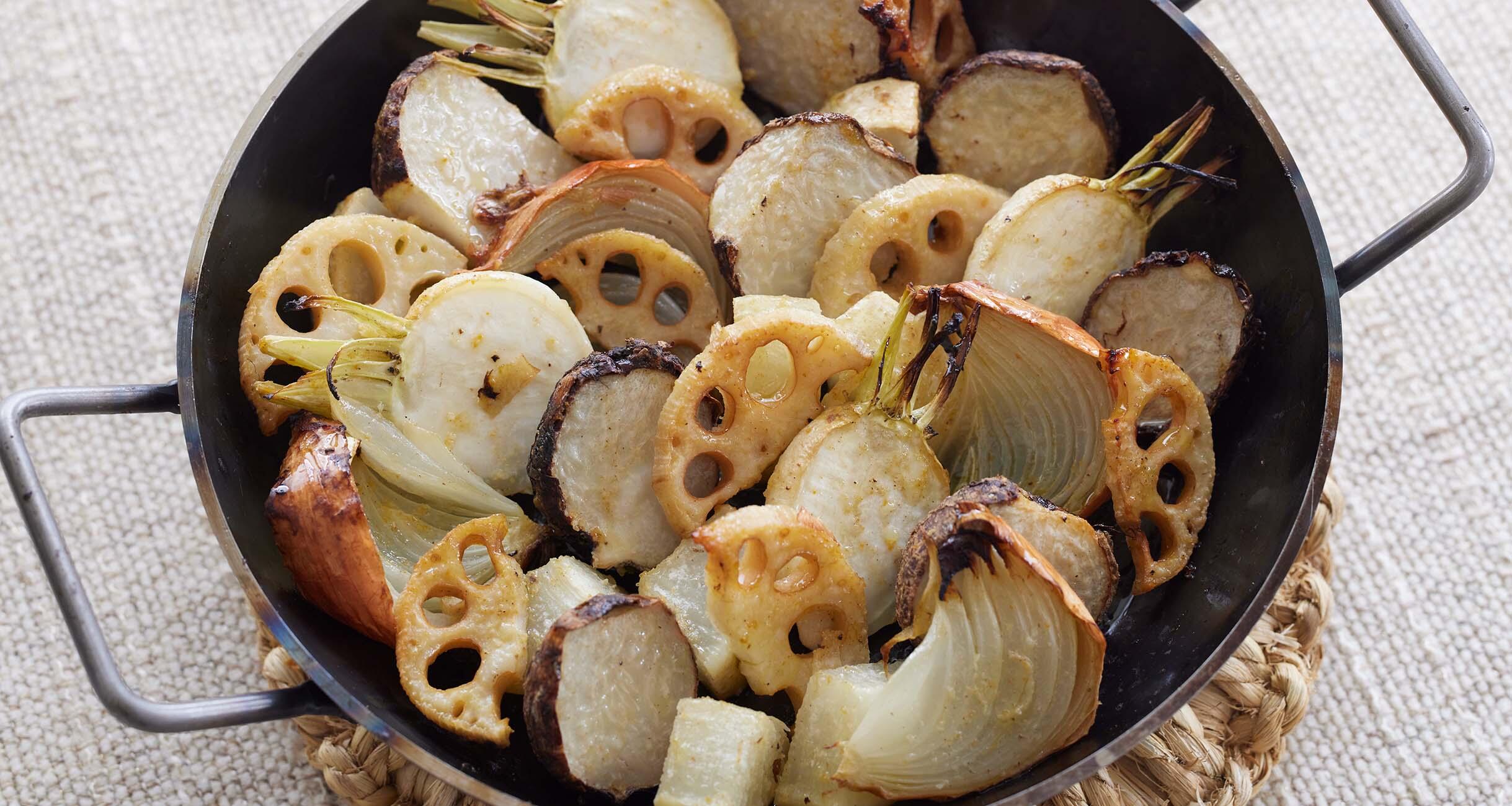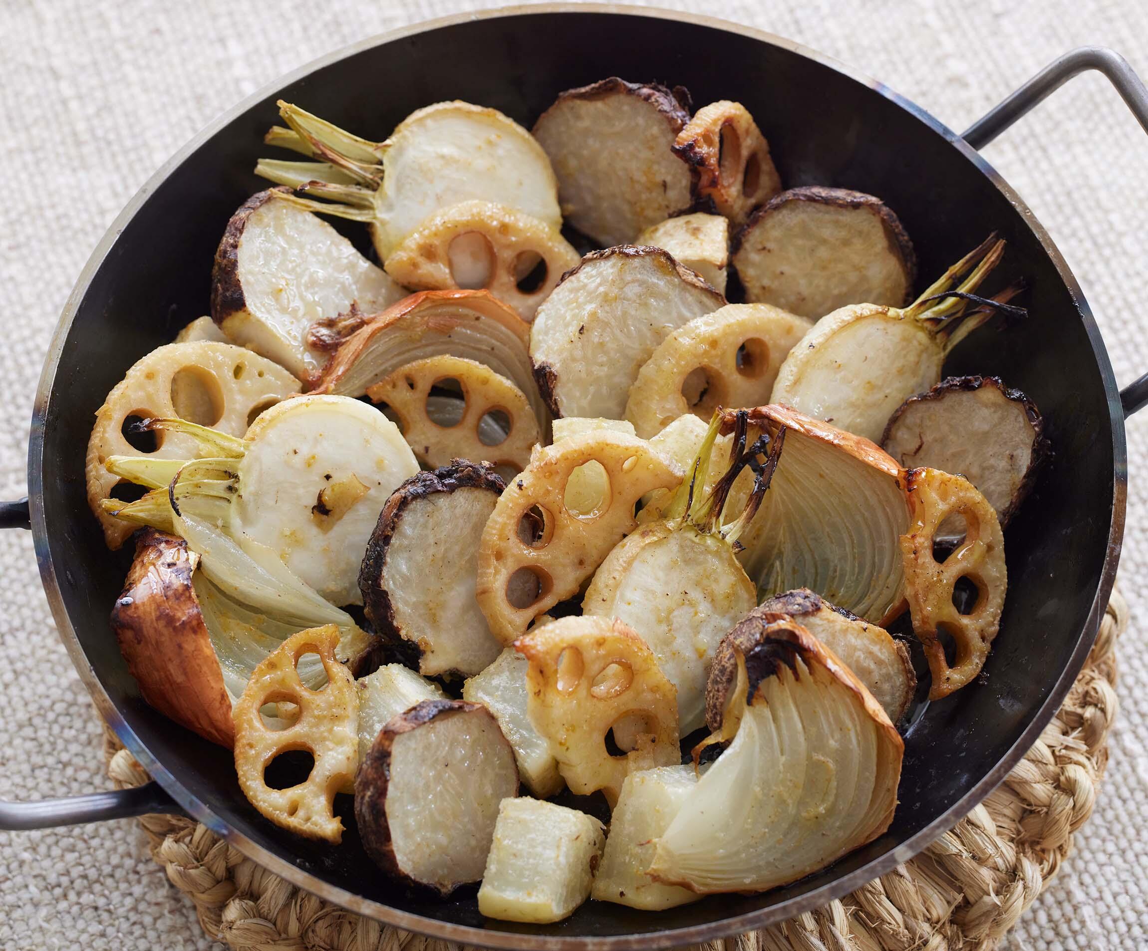 里いもは皮ごと2つに、玉ねぎは皮ごと1/8のくし形切りに、れんこんは皮をむいて厚さ7mmの半月切りに、かぶは茎の根元も残して半割りに。大根は皮をむいて一口大の角切りにして、電子レンジ(600W)で60秒ほど温める。