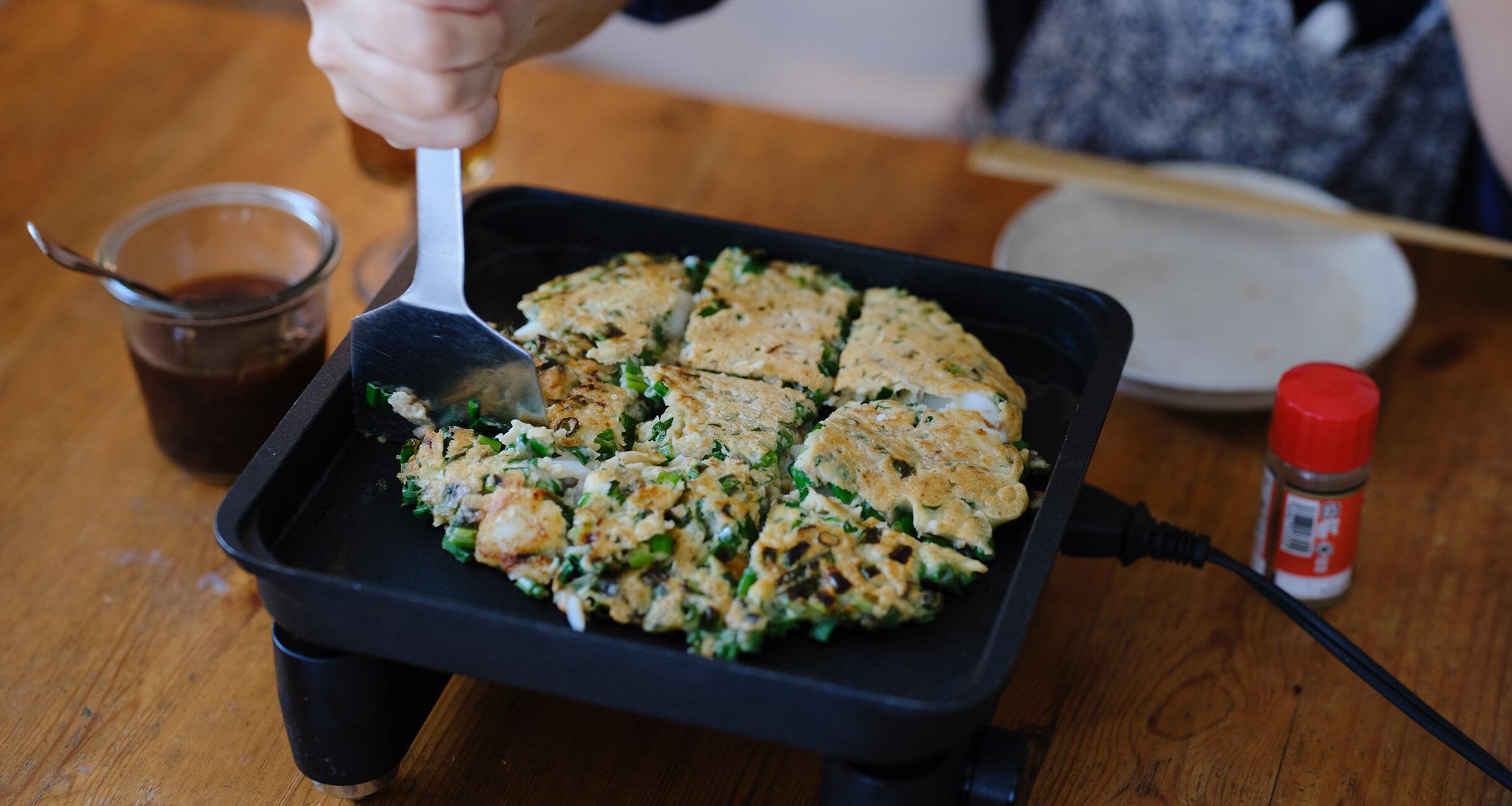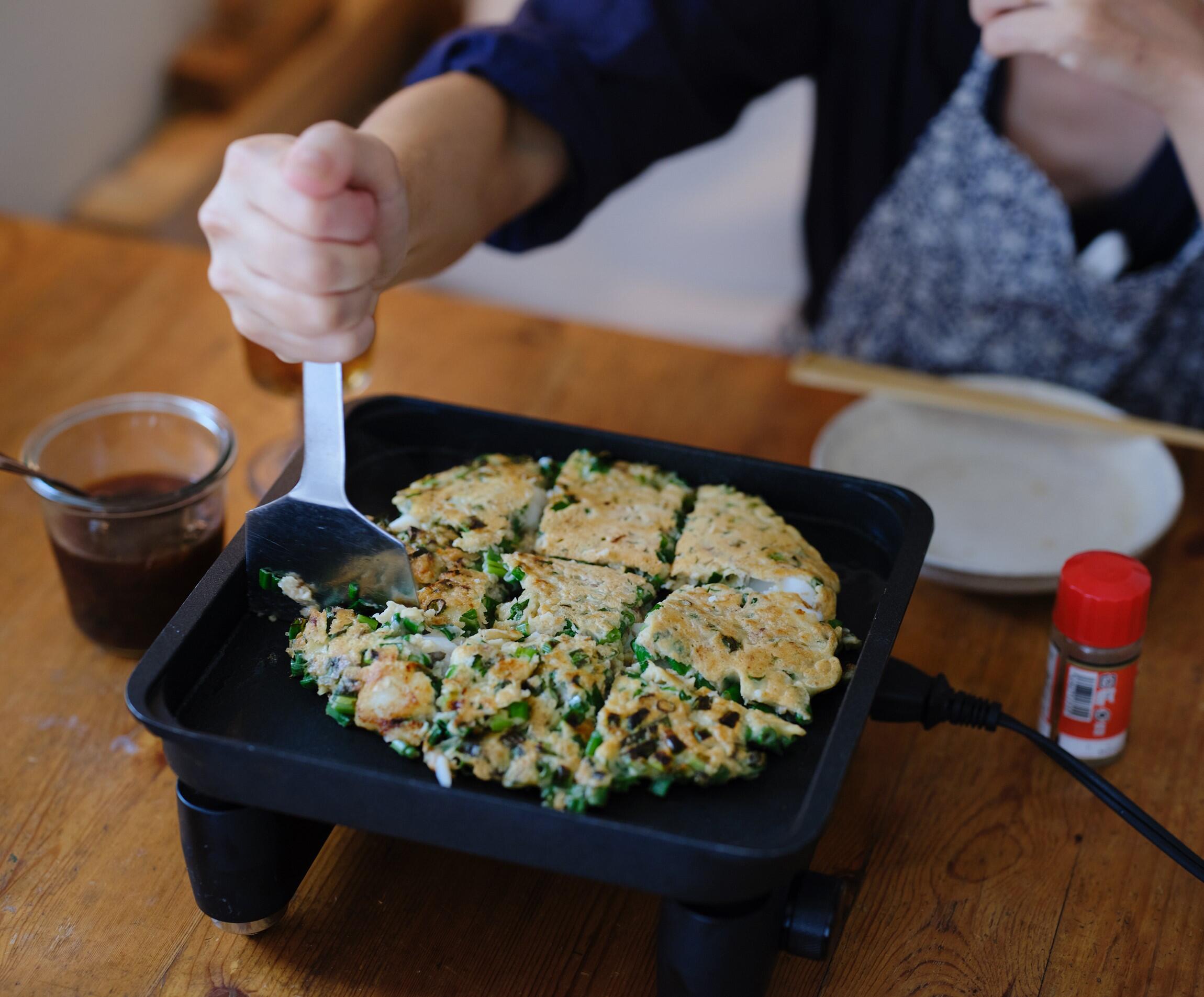 温めたホットプレートに米油をひき、①の生地を丸く流す。両面がきつね色になるまで約5分焼き、食べやすい大きさに切る。混ぜ合わせたたれを添える。好みで七味をふる。