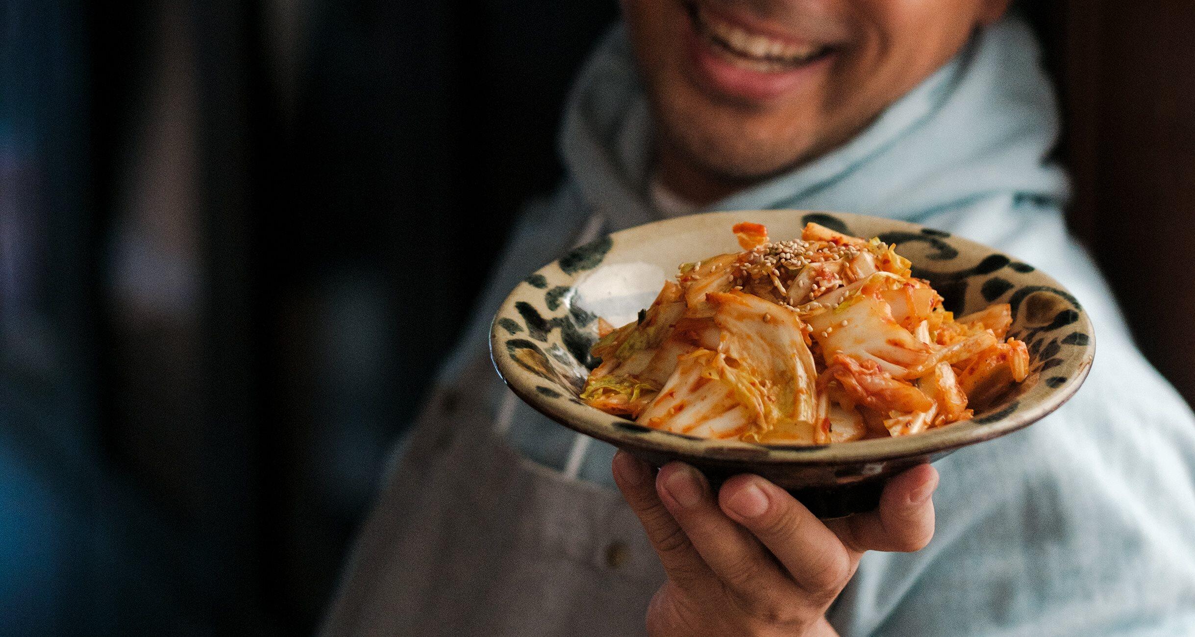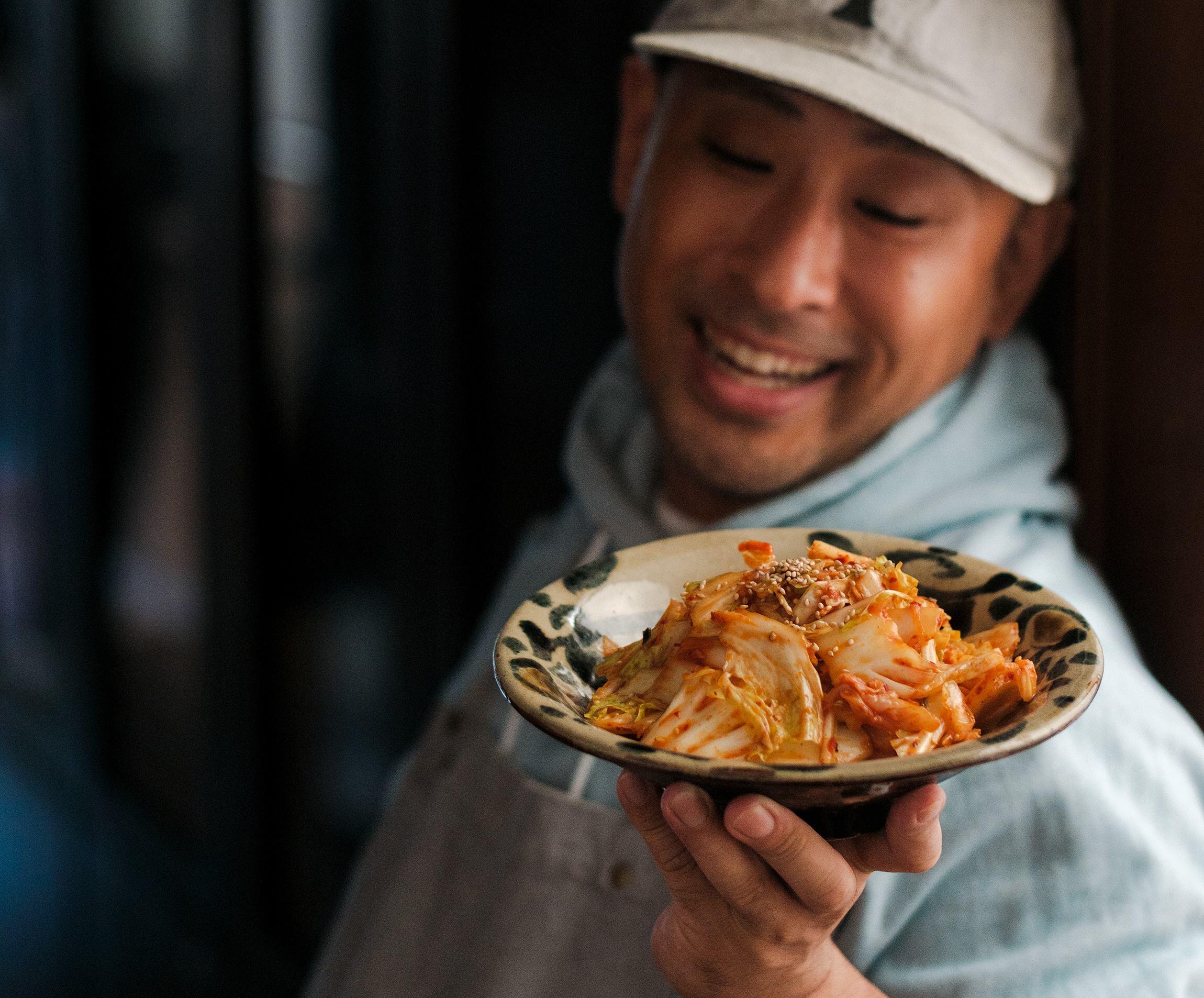 【きじま】ムンチとは韓国語で「もむ」という意味。このムンチは子供の頃から通っていた焼き肉店のサラダをヒントにしたもの。白菜を白菜キムチでもむだけだと味が薄くてつまみにならないので、コチュジャンで味を補強し、胡麻油でコクをプラスするのが旨さのコツ。