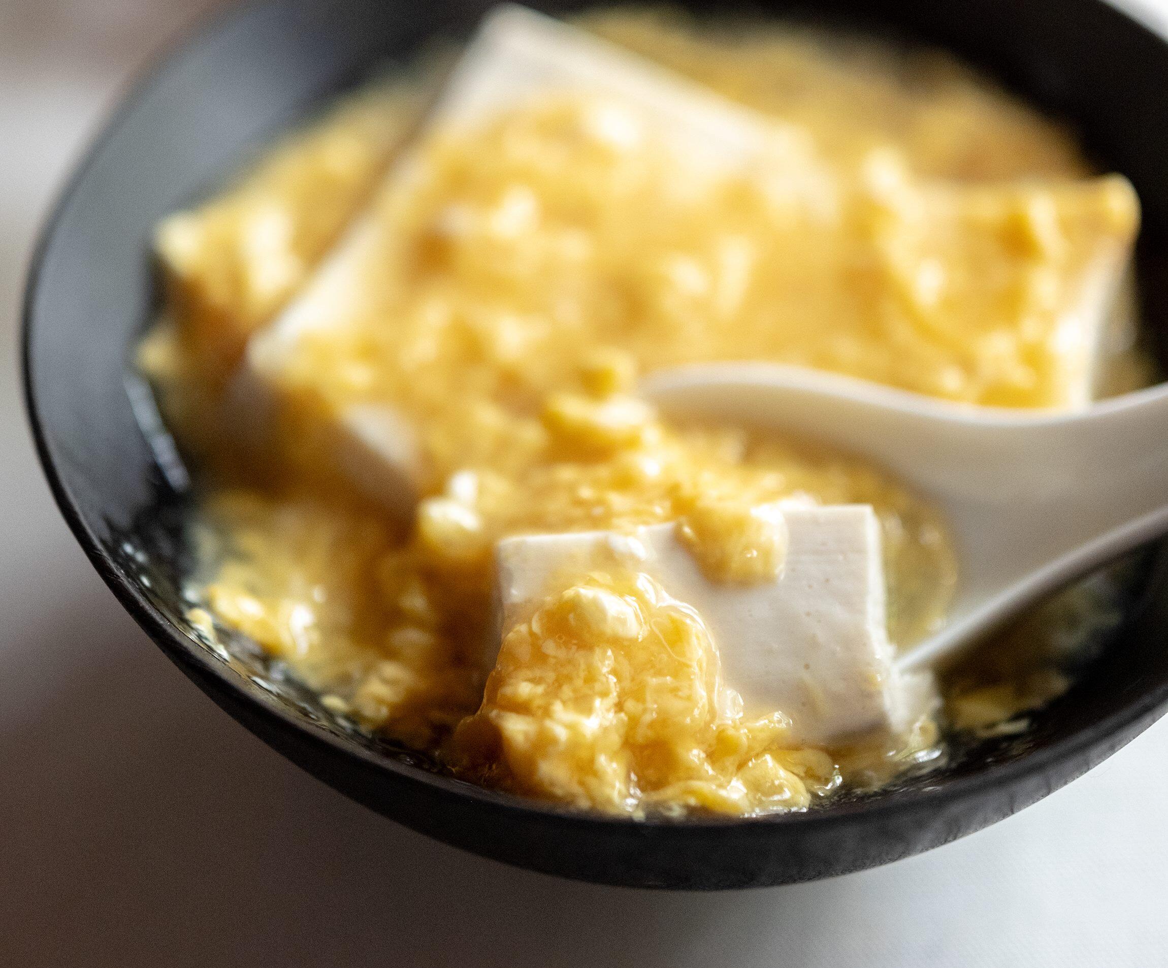 【吉田】「かき玉あんかけ温やっこ」は、お椀代わりやお酒のシメにもなる優しい味わい。軽く煮立たせただしに溶き卵を細~く加えると、美しい仕上がりに。