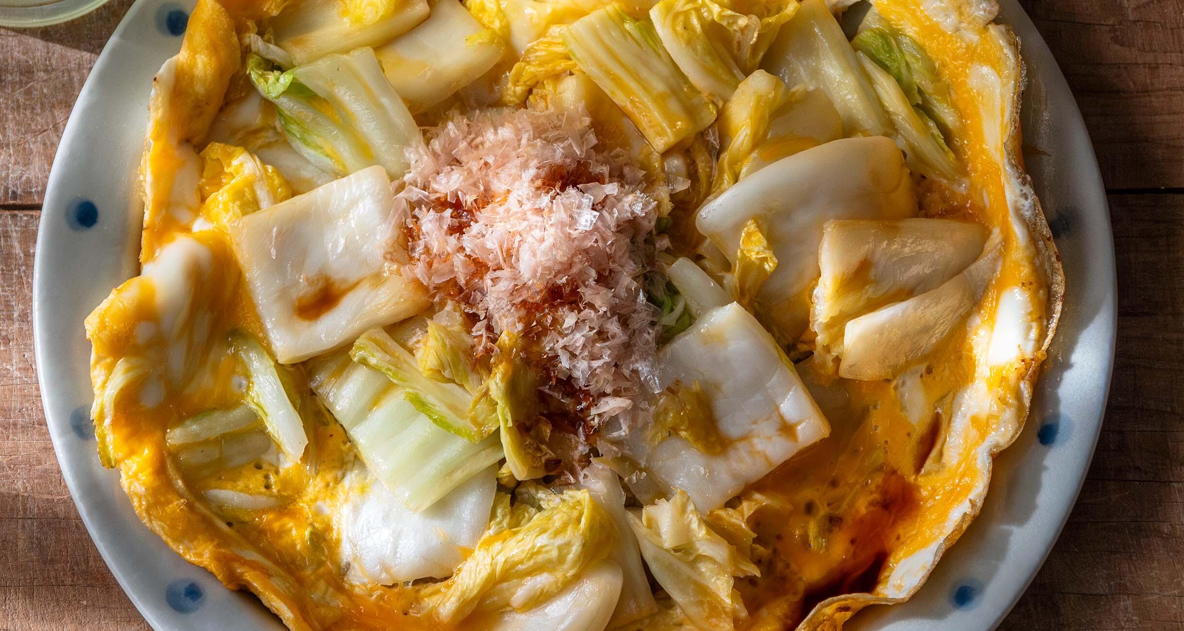 フライパンに油を中火で熱し、②の白菜漬けを2~3分炒める。フライパンの中心に集めて、溶き卵を白菜漬けの上に流し入れて軽く混ぜ、卵に火が通るまでいじらず焼く。
