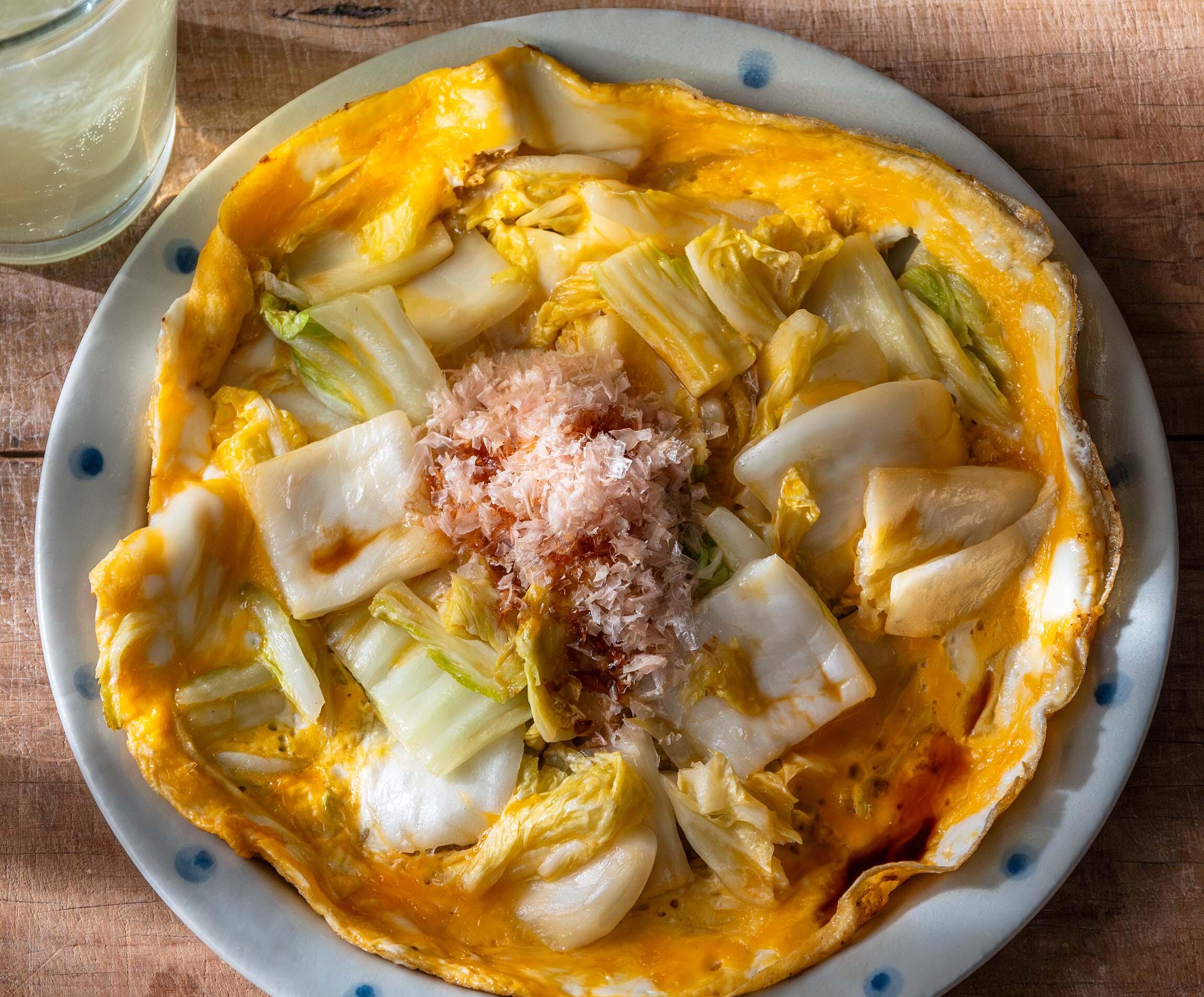 白菜の漬物と卵を焼いて、削り節を振りかけるというシンプルなつまみ料理です。料理家の先輩きじまりゅうたさんと、後輩吉田愛さん。同じお題で、それぞれが自慢のつまみをつくってもらいました!