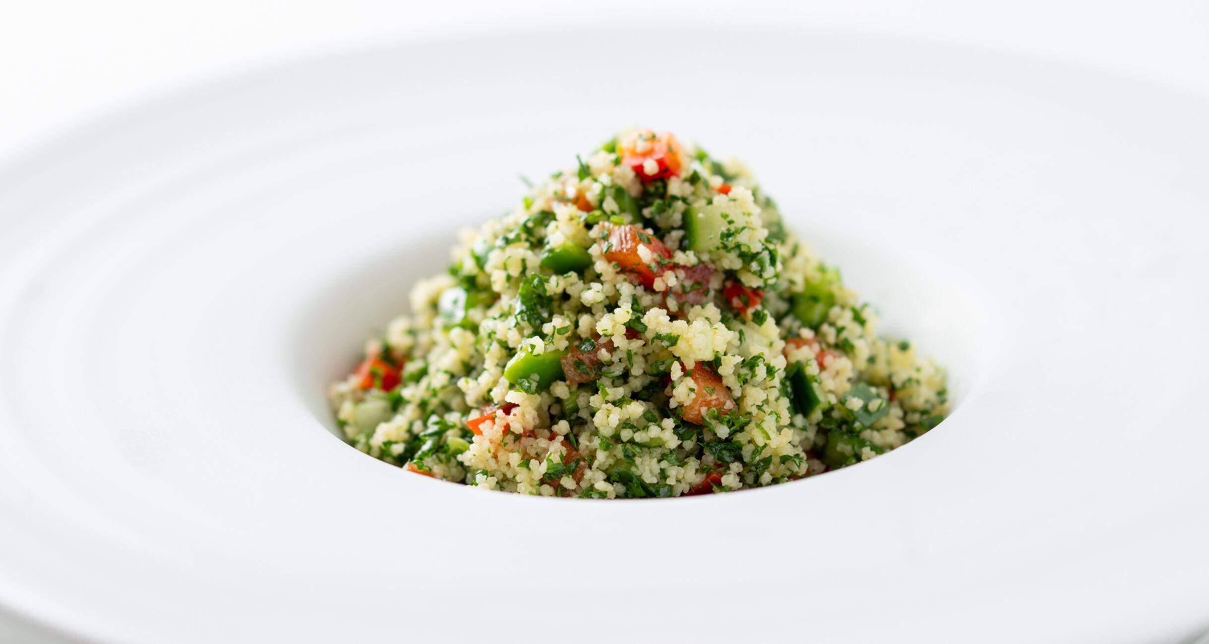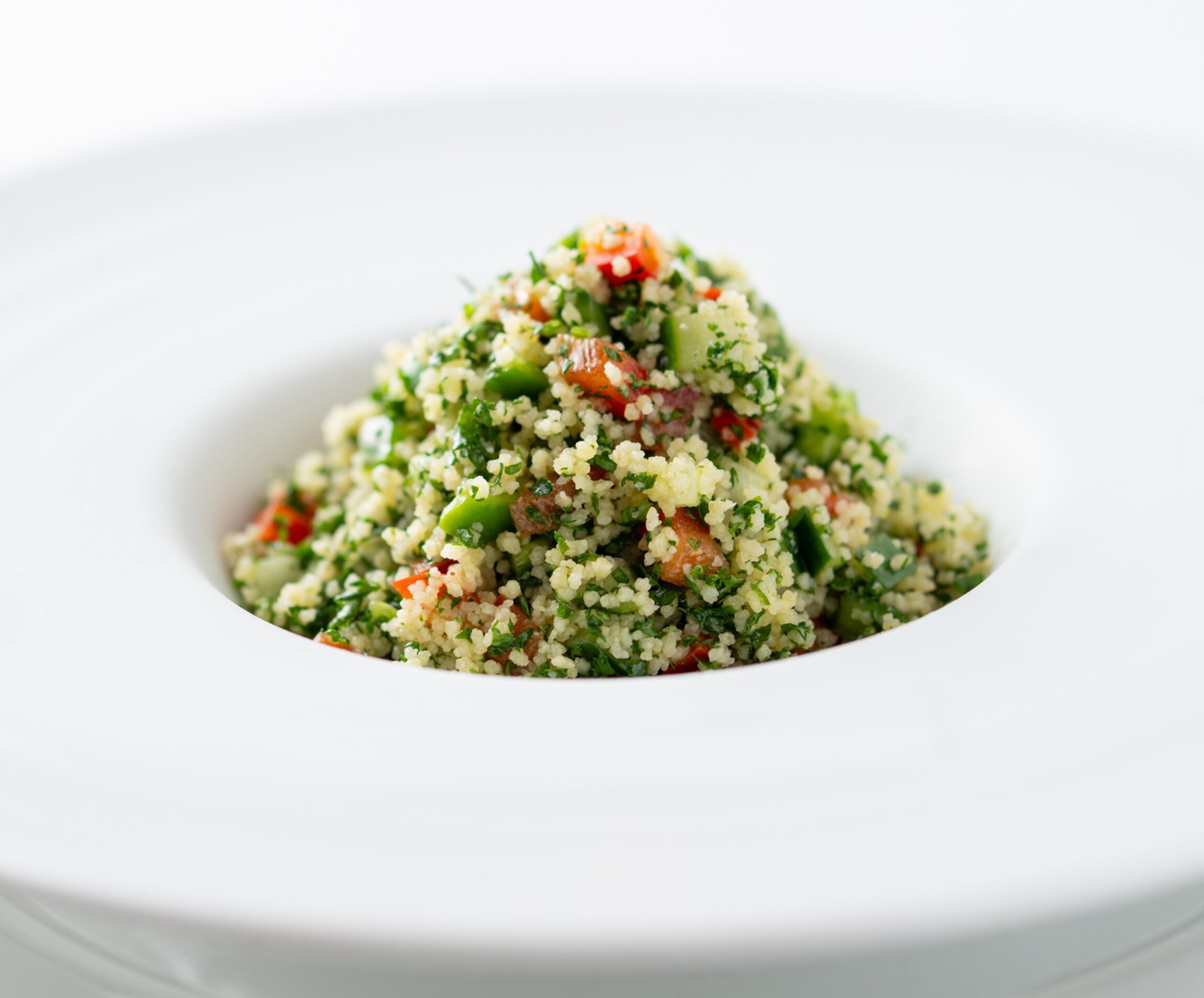 「サラダタブレー」は、『ビストロ・サン・ル・スー』でも人気のメニュー。ミントとビネガーの爽やかな香りが鼻を抜け、プチプチとしたクスクスと角切り野菜の食感のコントラストが楽しく、なんとも食欲をそそるのだ。味の要は、自家製ビネグレッドソース。フランボワーズビネガーのチャーミングな香りと、赤ワインビネガーのキュッとした酸を掛け合わせたドレッシングで、この店のすべてのサラダに使っている万能品だ。