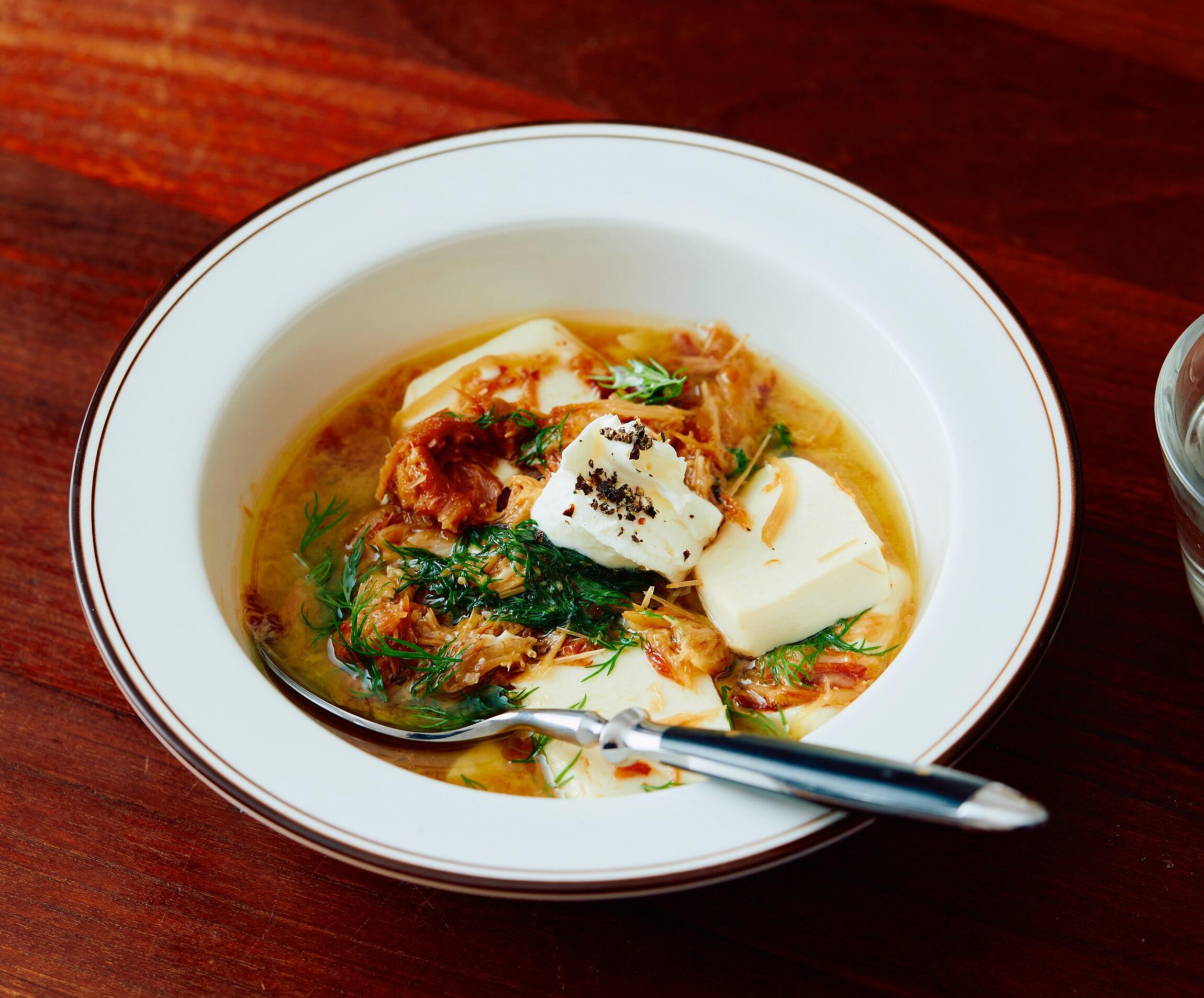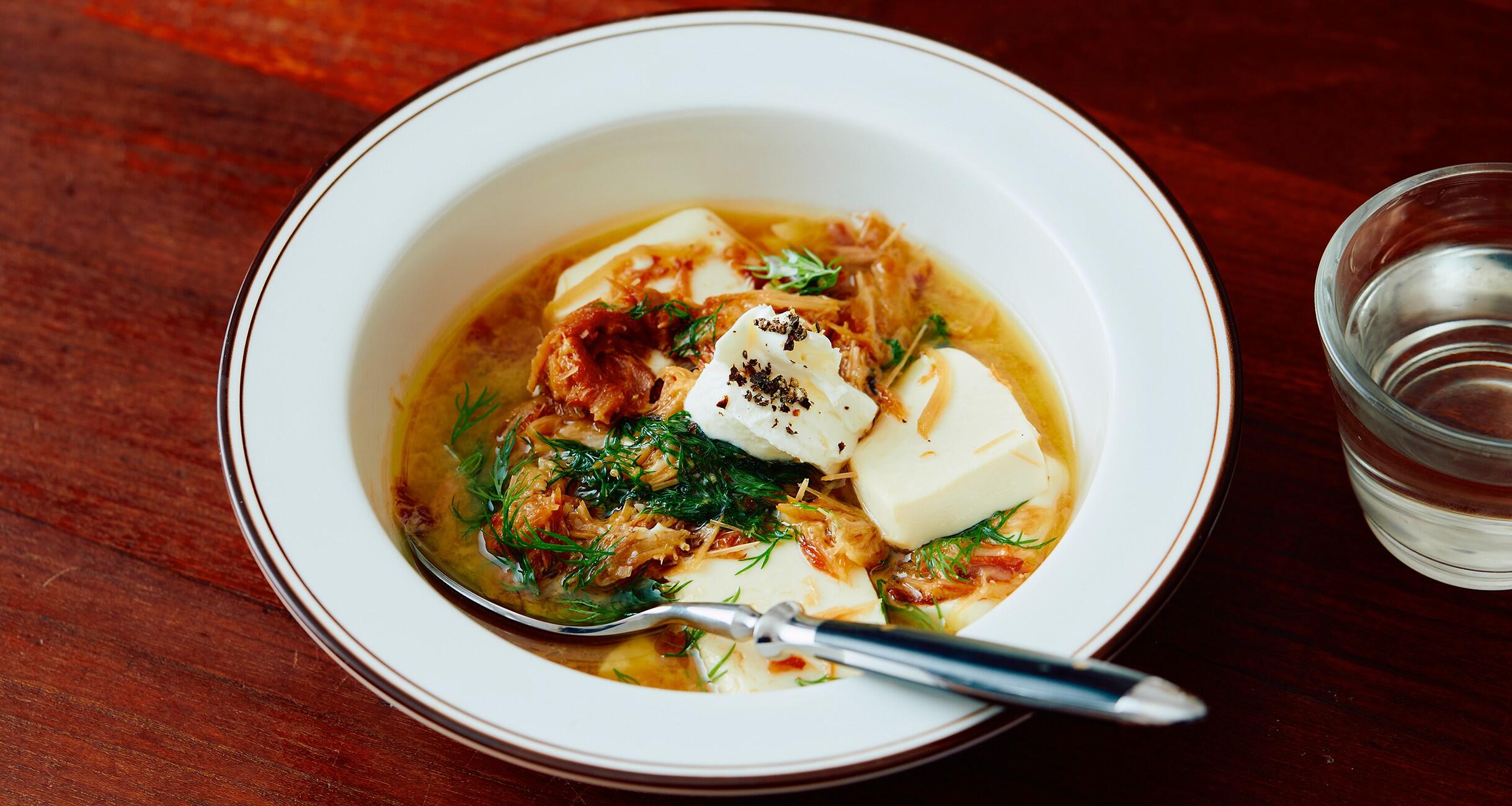 ボルシチはカレイの縁側缶を水で煮込む。こうすることで、レトルト臭が飛んでカレイの旨味と煮汁の旨味がよみがえる。具には豆腐を加え、カレイの旨味をしっかり吸わせる。この段階で味見をすると、甘辛い煮汁がぷるぷるの豆腐にしみ込んで、白飯を欲するような一品になっていた。これだけで十分美味しいのに、なぜボルシチに?