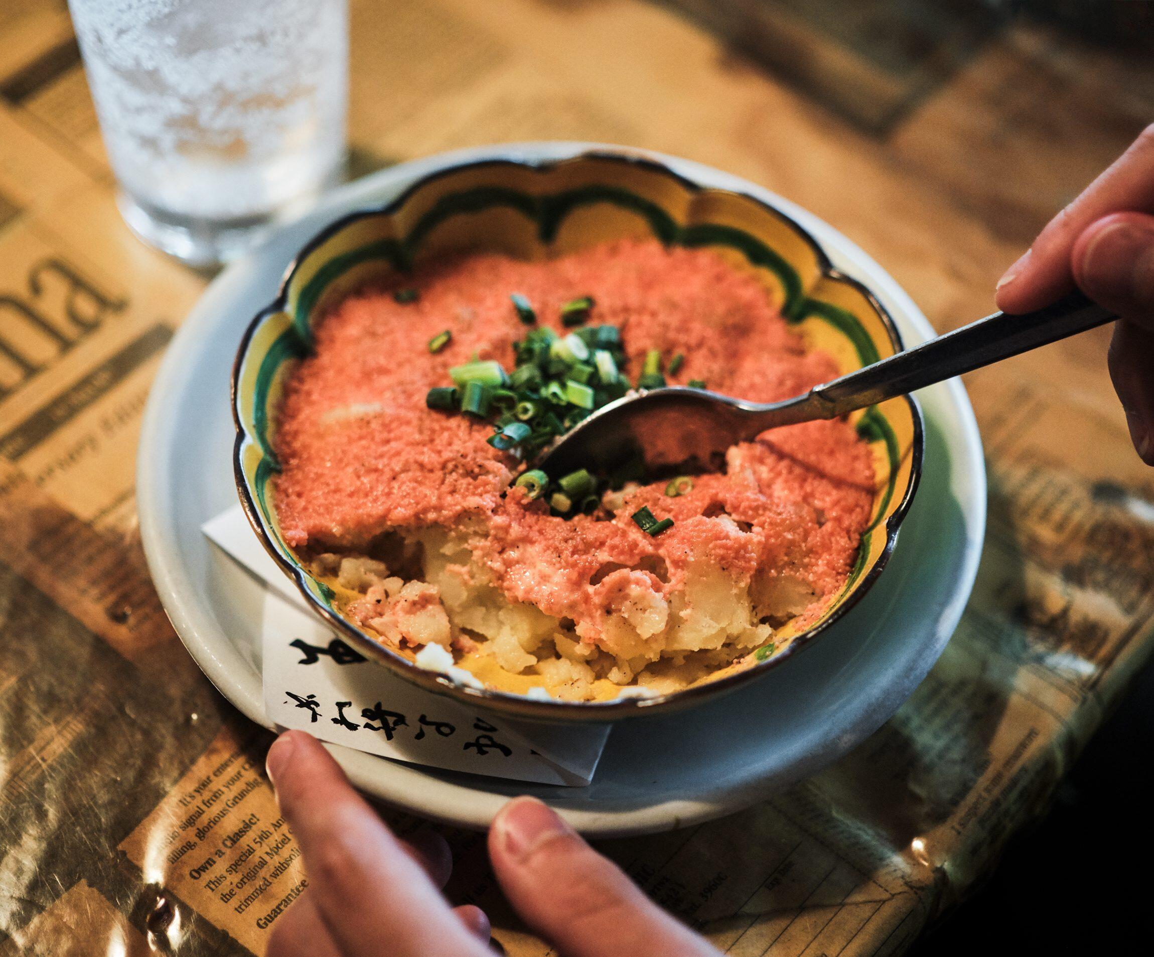 マッシュしたじゃがいもに、バターと生クリーム入りの明太マヨネーズがかかってこってりと油っ気のある味わい。