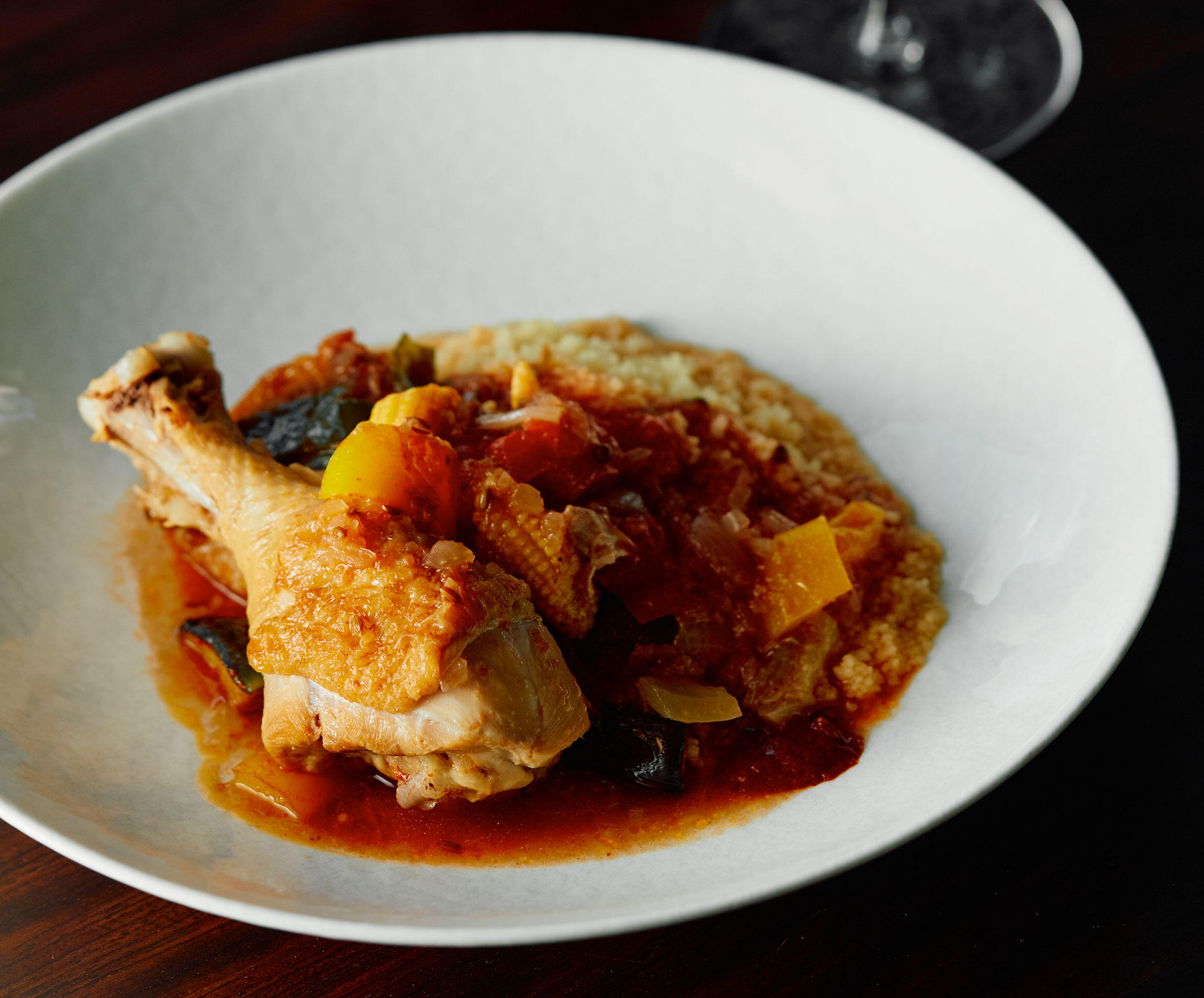ジューシーな鶏肉と野菜の旨味が調和。野菜それぞれの旨味と甘味が鮮明に凝縮している。バター風味のクスクスで味わいがふくよかになり、粒感がアクセントに。ボディ感のある“ボーペイサージュ”のメルローにマッチ。