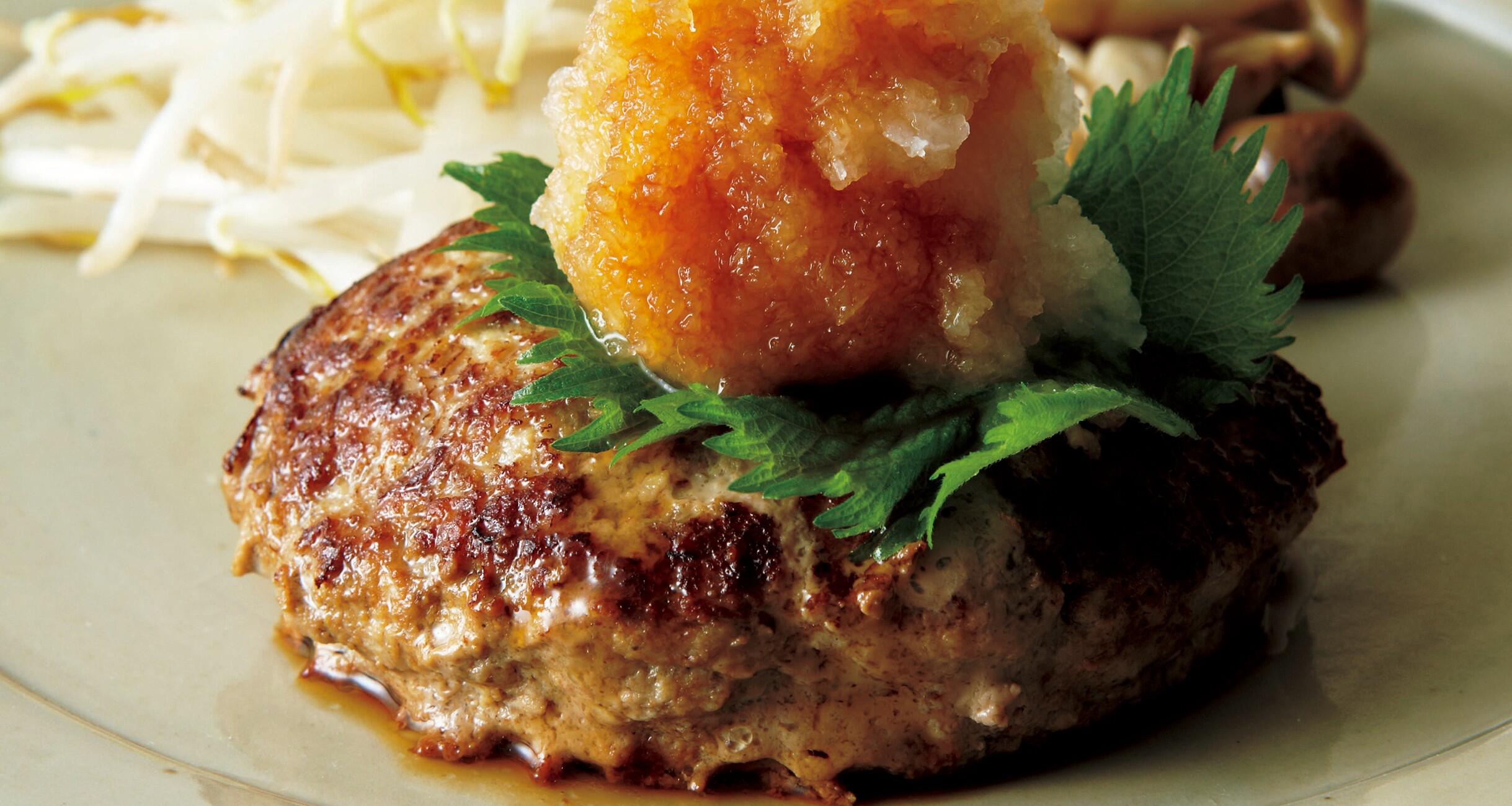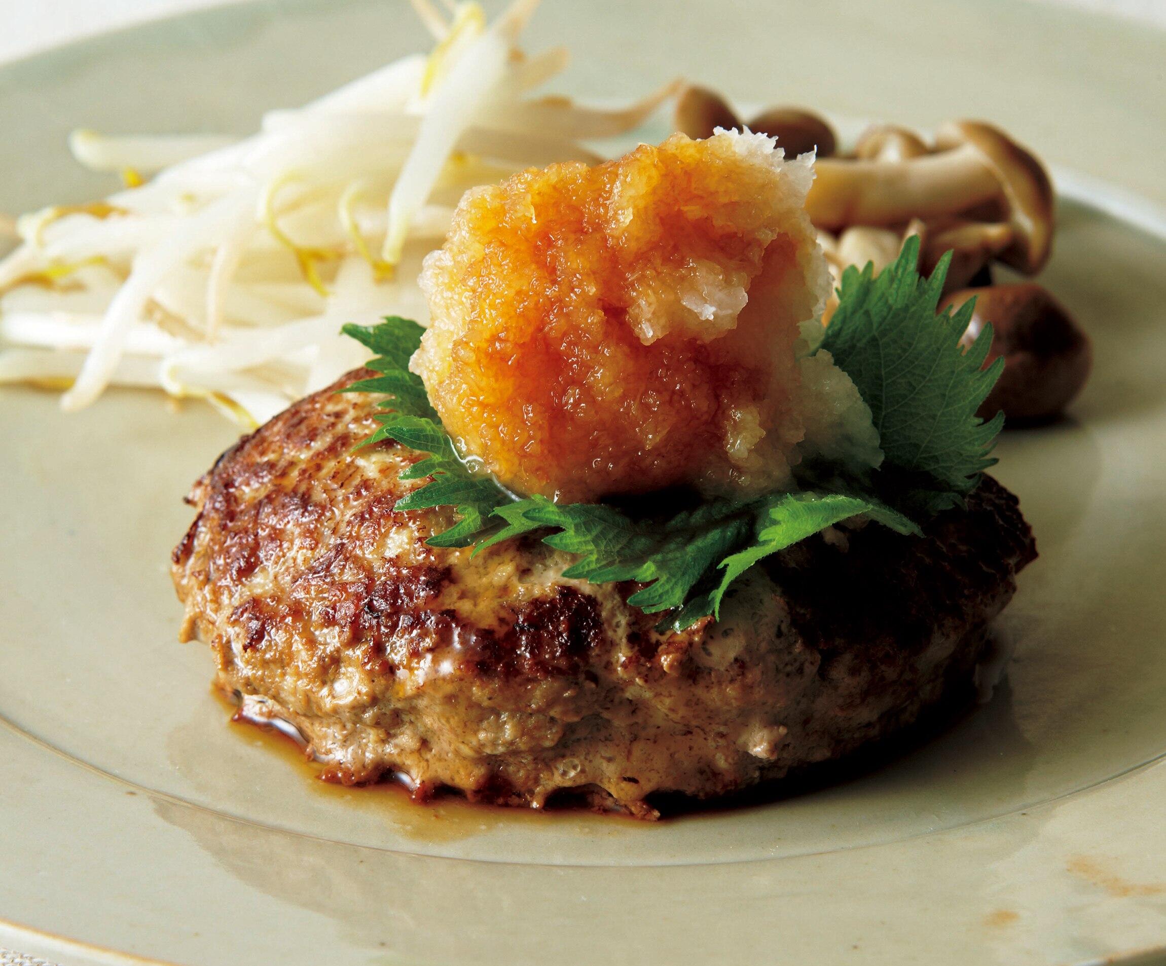 器にハンバーグを盛って青じその葉をのせる。その上に大根おろしをのせてポン酢をかける。しめじ、もやしを添える。