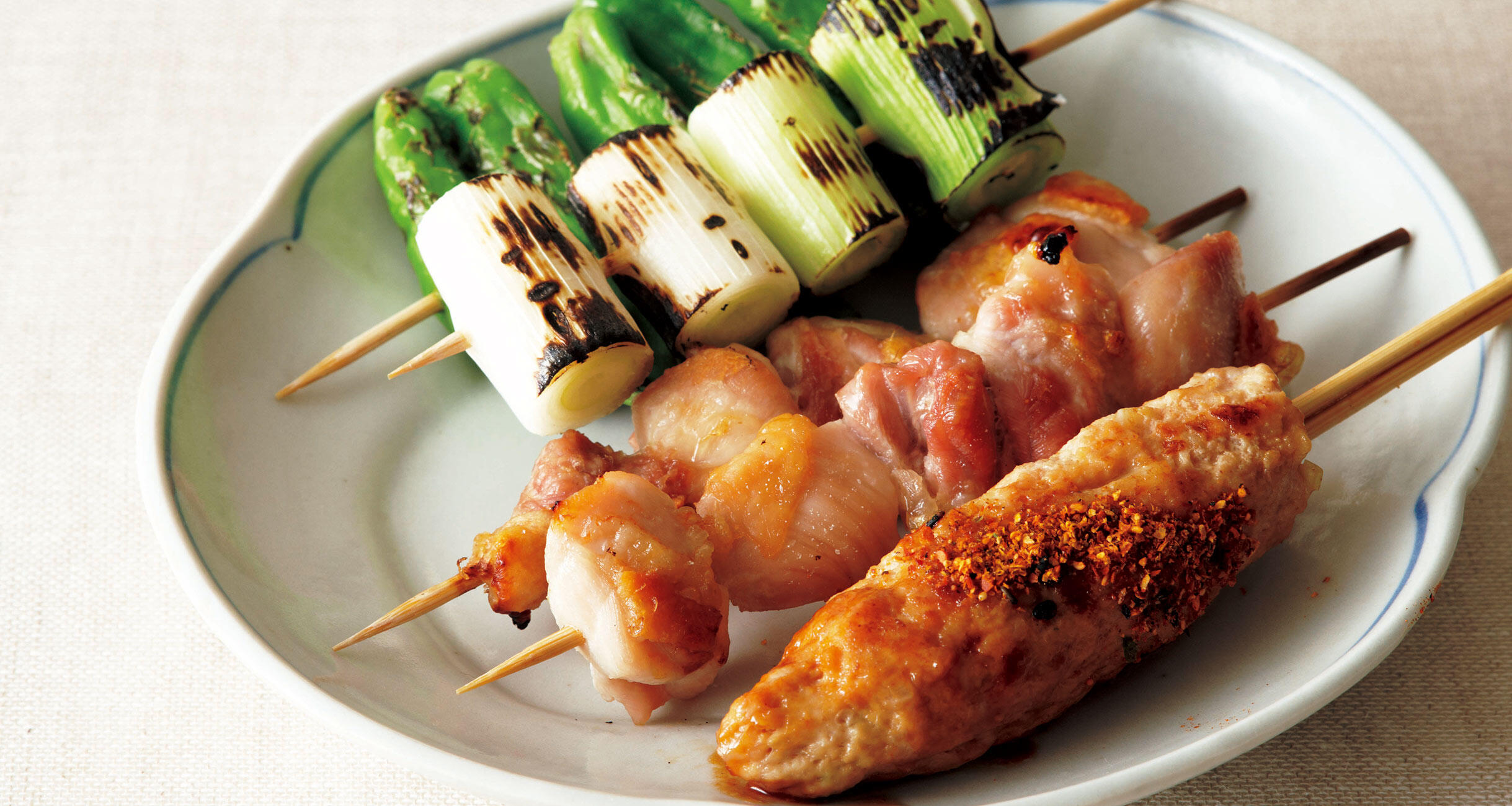 鶏肉は2.5cm角に切って竹串に刺す。長ねぎは2.5cm長さに切って竹串に刺す。しし唐も竹串に刺す。