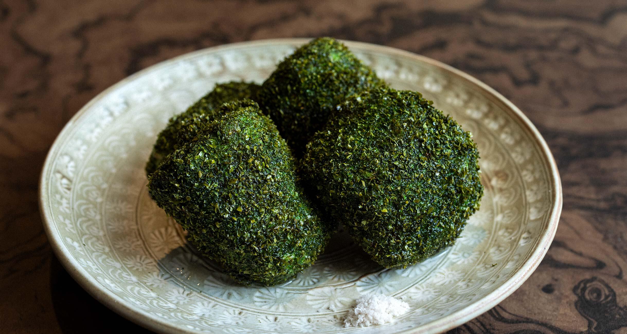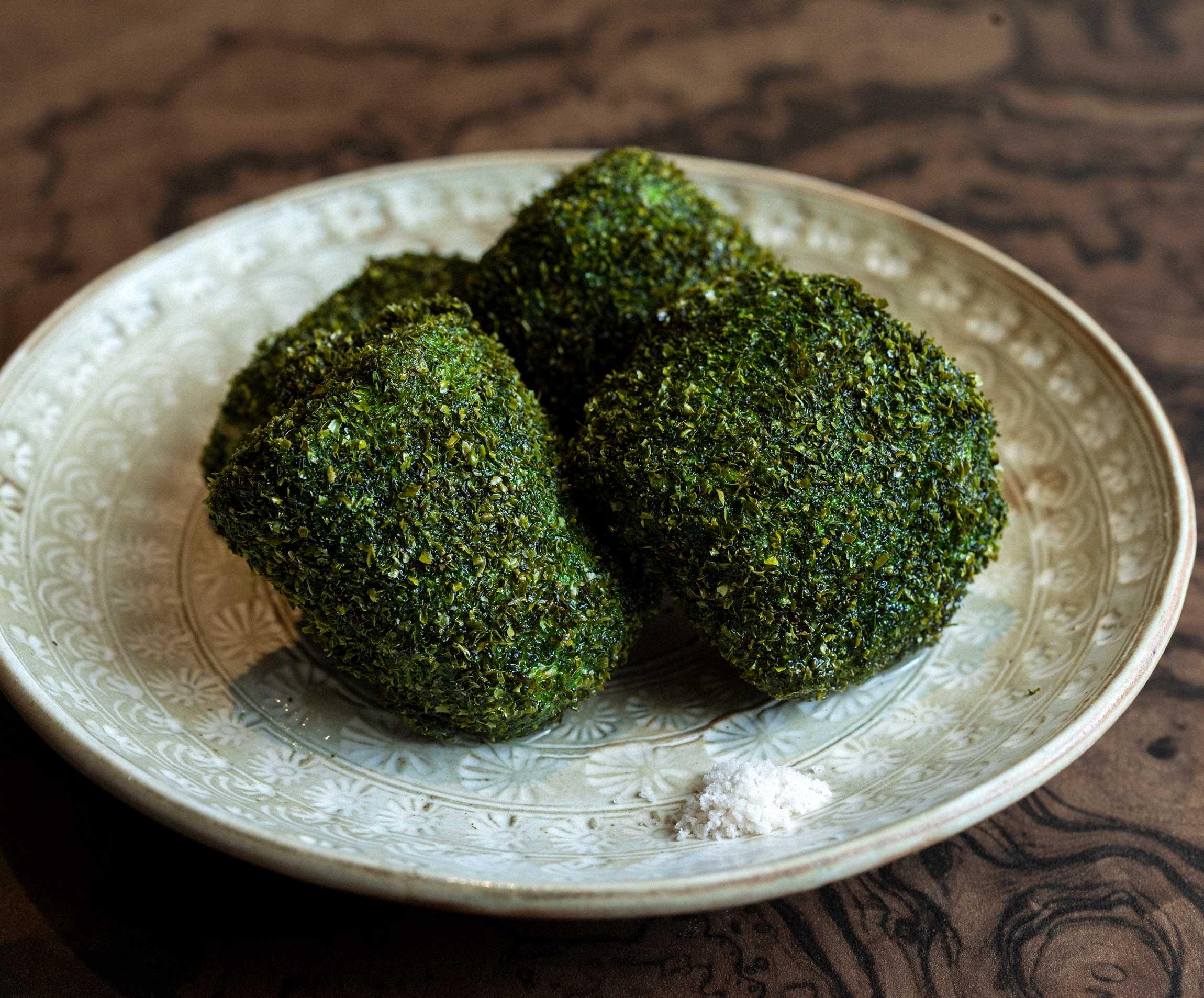2の海老芋の汁気を拭き、満遍なく小麦粉をまぶす。しっかり溶きほぐした卵白をからめて、あおさ粉を表面にまぶす。たっぷりの揚げ油を170℃に熱して海老芋を入れ、途中で上下を返し、カリッとするまで3~4分揚げる。器に盛り、塩を添える。