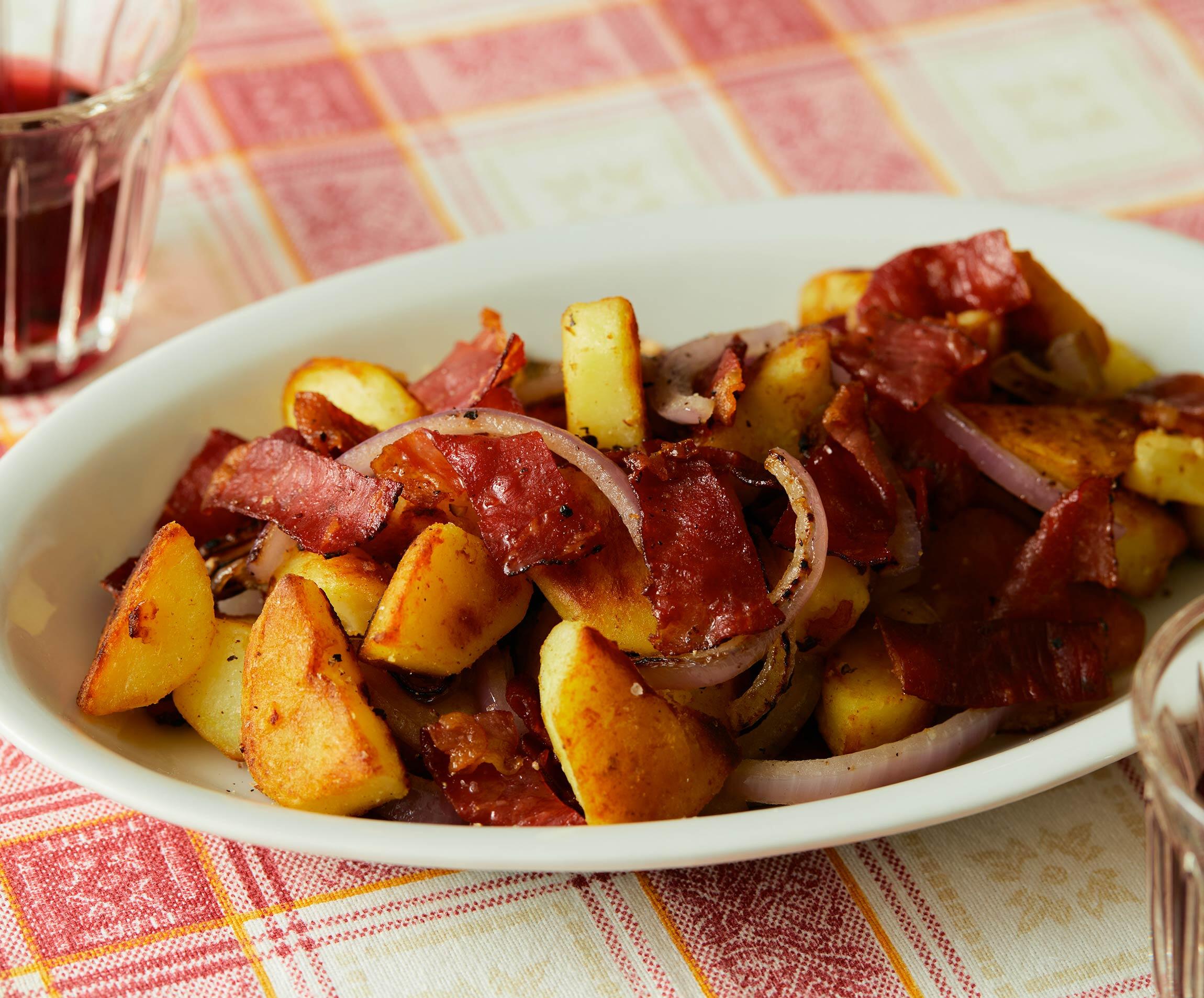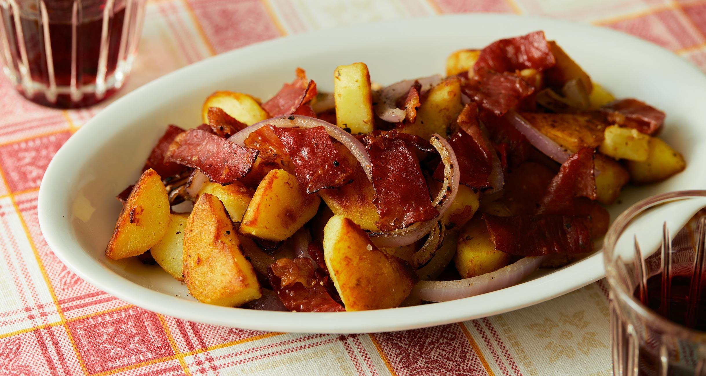 1回目は、アンペッツォ風ポテト。いわゆるジャーマンポテトのような料理だが、味のポイントは、現地でさまざまな料理に使われる燻製した生ハム、スペック。この風味をまとわせたじゃがいもが、後をひくおいしさなのだ。