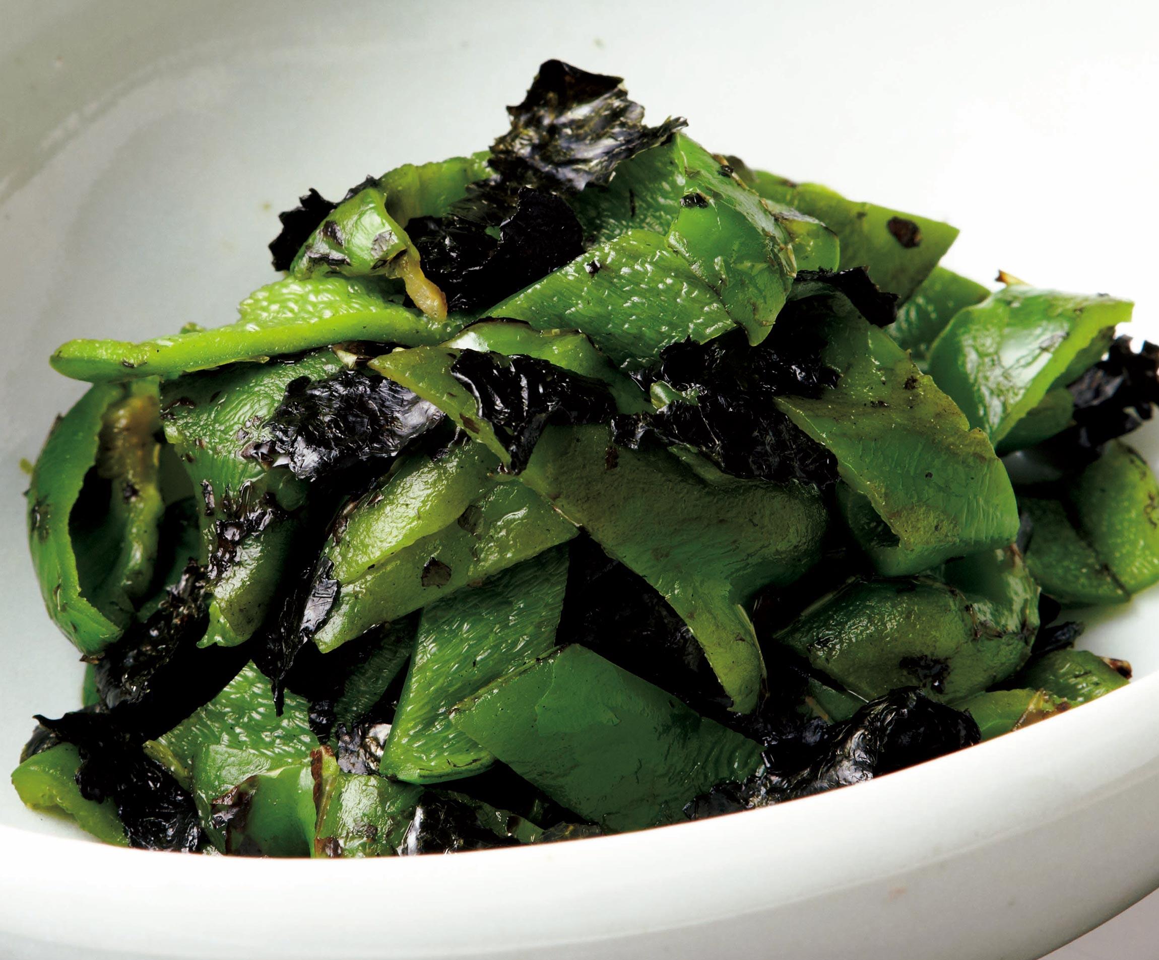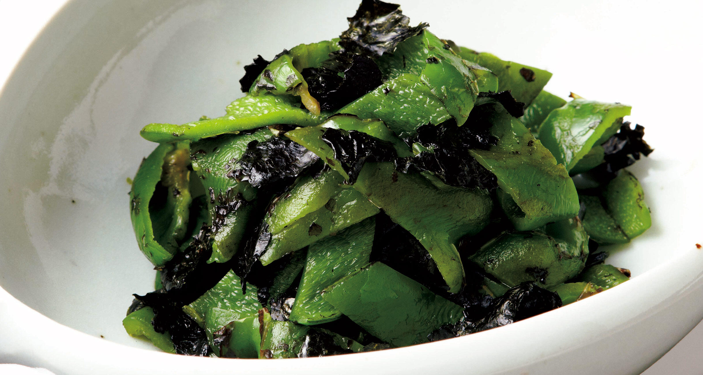 ピーマンは縦半分に切ってへたと種を取る。焼き網で皮目を黒く焼き、裏に返して少ししんなりするまで焼き、粗熱が取れたら皮を指でこするようにしてむき取り、1cm幅の斜め切りにする。