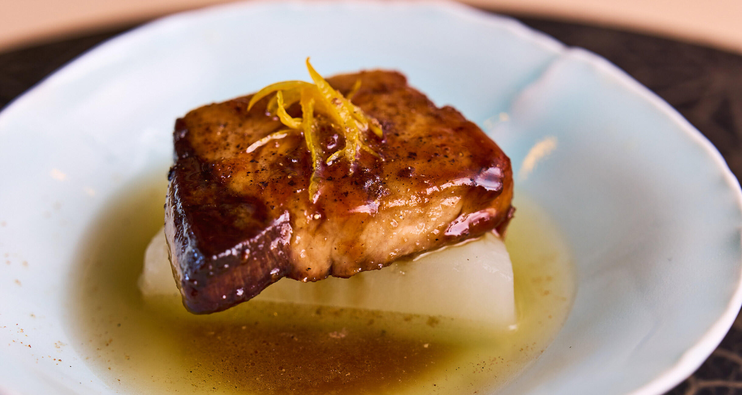 器に大根を置き、その上に焼いた鰤をのせる。大根の煮汁を大さじ2程度を器に張り、3の照り焼きだれ少々をかける。せん切りにした柚皮と粉山椒を好みでふり完成。