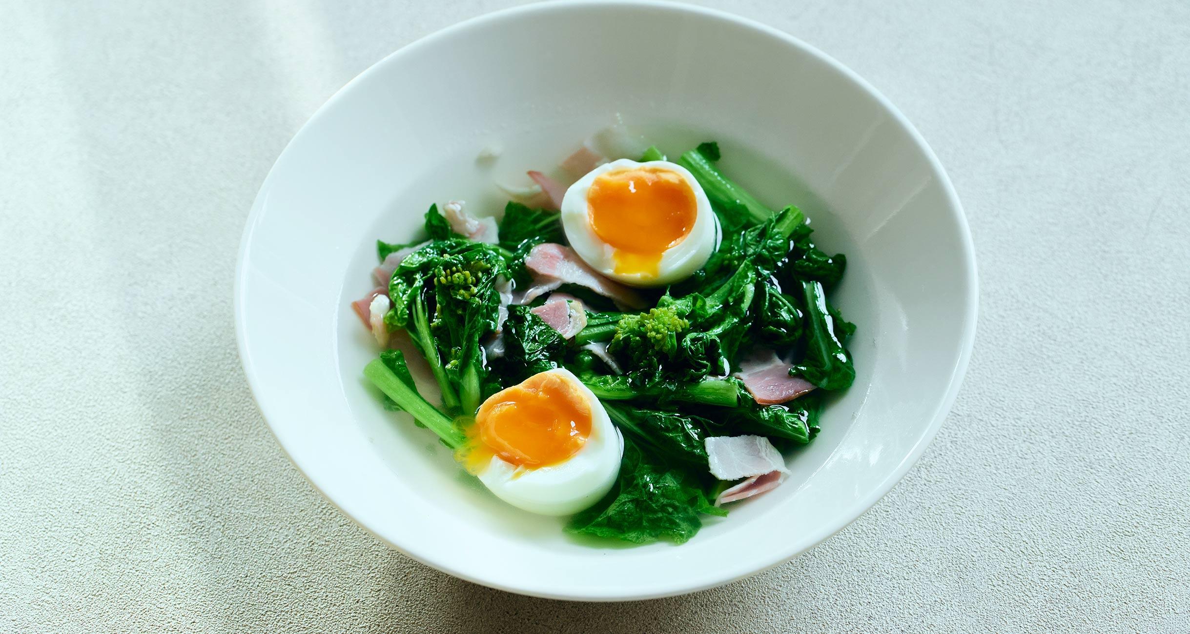 朝晩がまだ冷え込む4月って、温かくて元気の出るたまごスープを体が欲しますよね。ということで、スープ作家の有賀薫さんに、今お薦めの30品で4月1日から始まる「たまごスープ日めくりカレンダー」をつくっていただきました。毎日一品ずつ、30日で確実にたまご料理の腕が上がります。4月9日は春爛漫!「菜の花、ベーコン、半熟たまごのスープ」です。菜の花の苦味とベーコンの旨味と黄身のコクで、朝から幸せに満たされます。