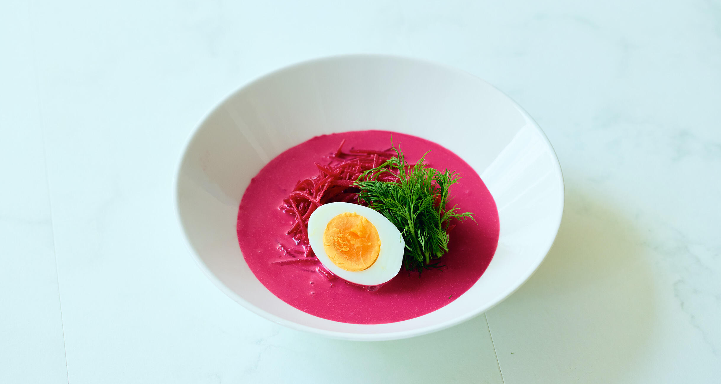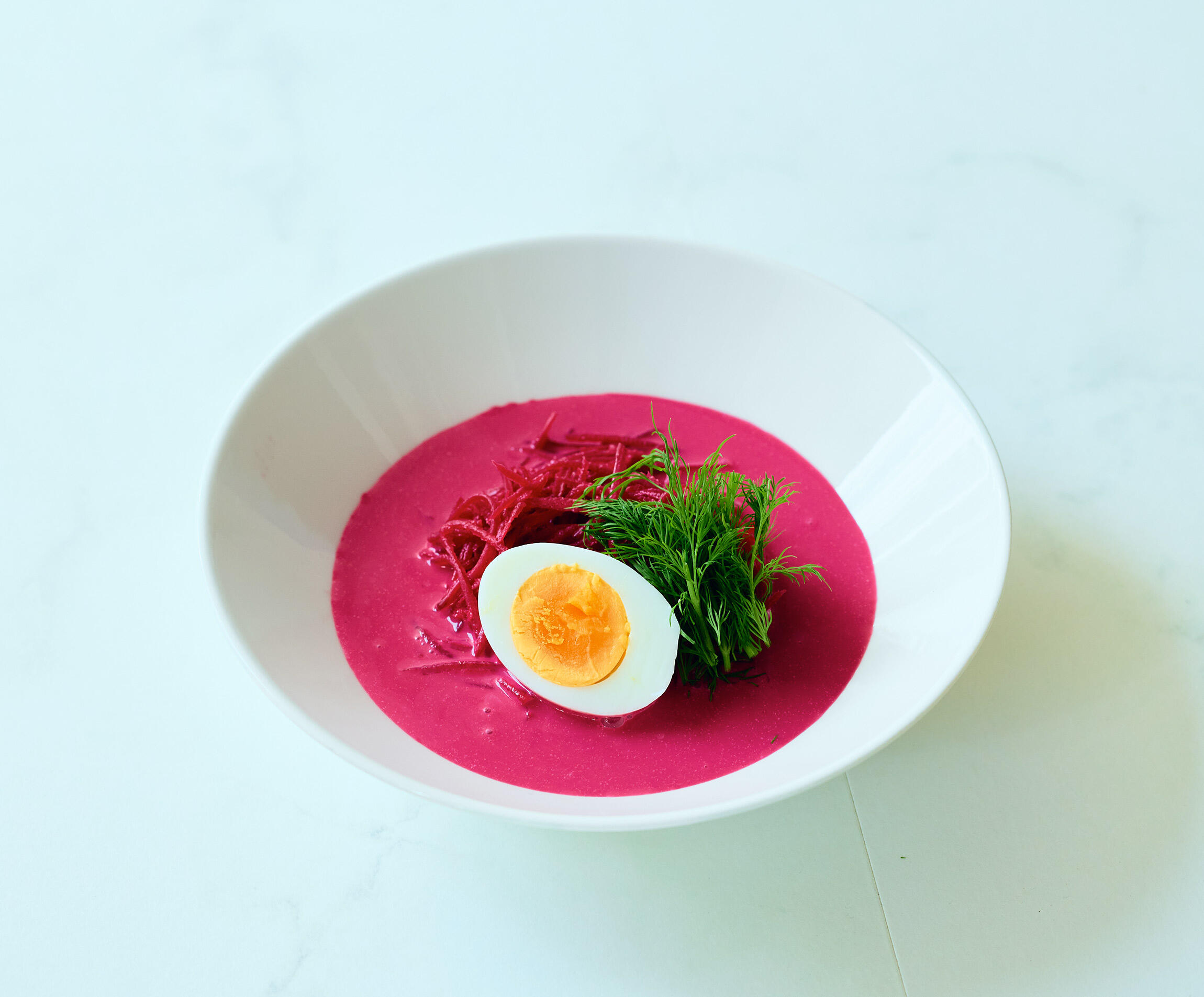 スープの粗熱を取って冷蔵庫でよく冷やす。皿にスープを盛りつけ、刻んだ残りのディルと半割りにしたゆで卵を添えて完成。