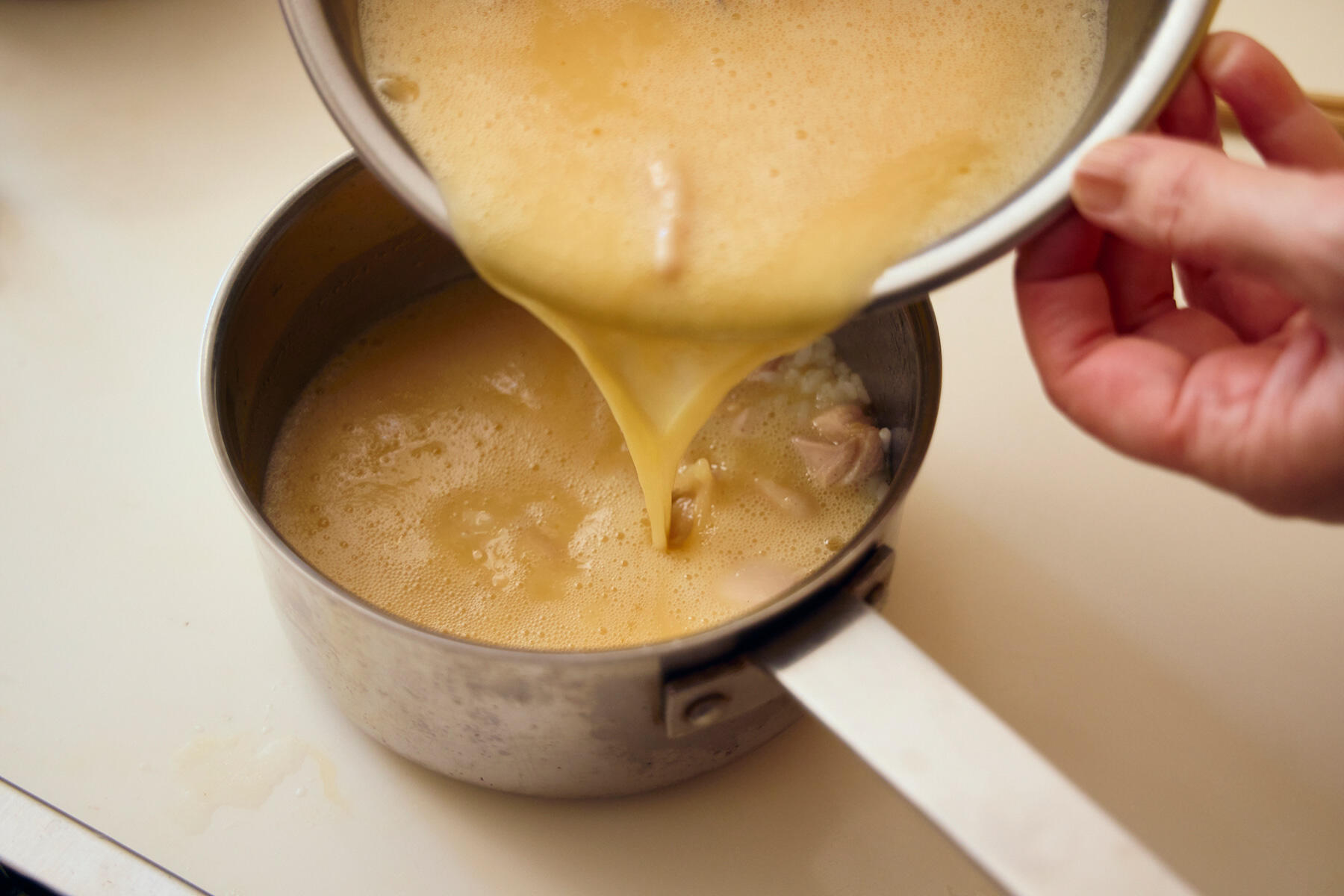 ボウルの端からスープをお玉ですくって少しずつ卵が入った③のボウルに加え(一度に加えると卵が煮えてしまうので注意!)、すべて入れたら鍋に戻す。味をみて塩(分量外)、胡椒で調える。