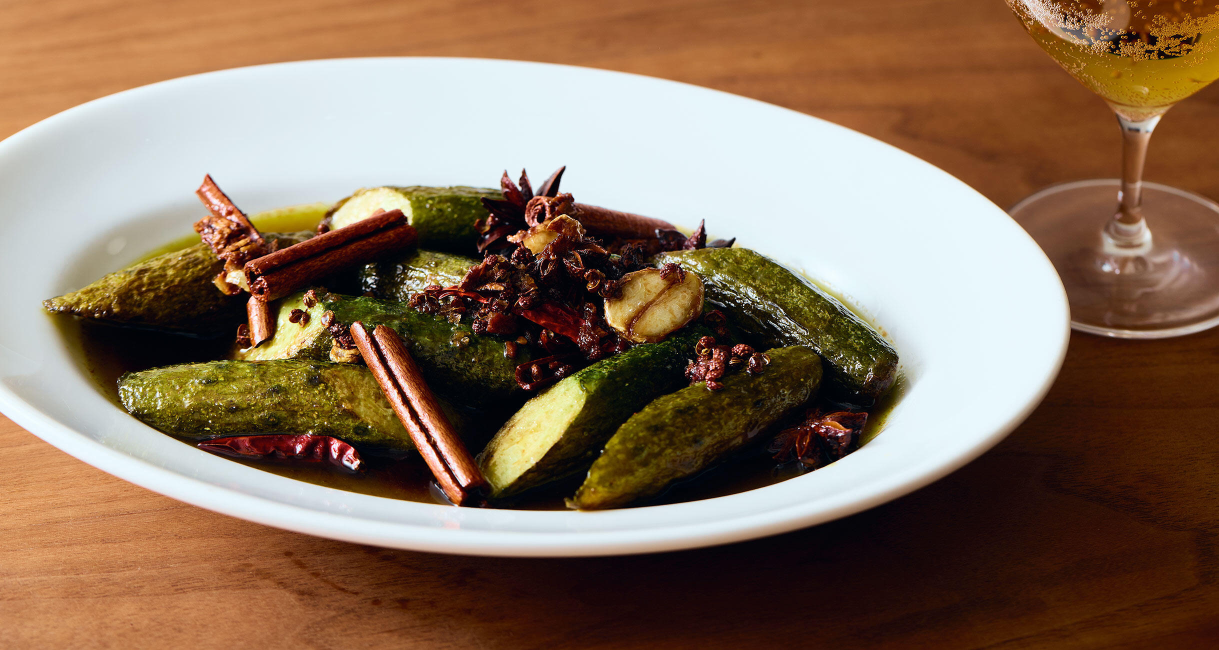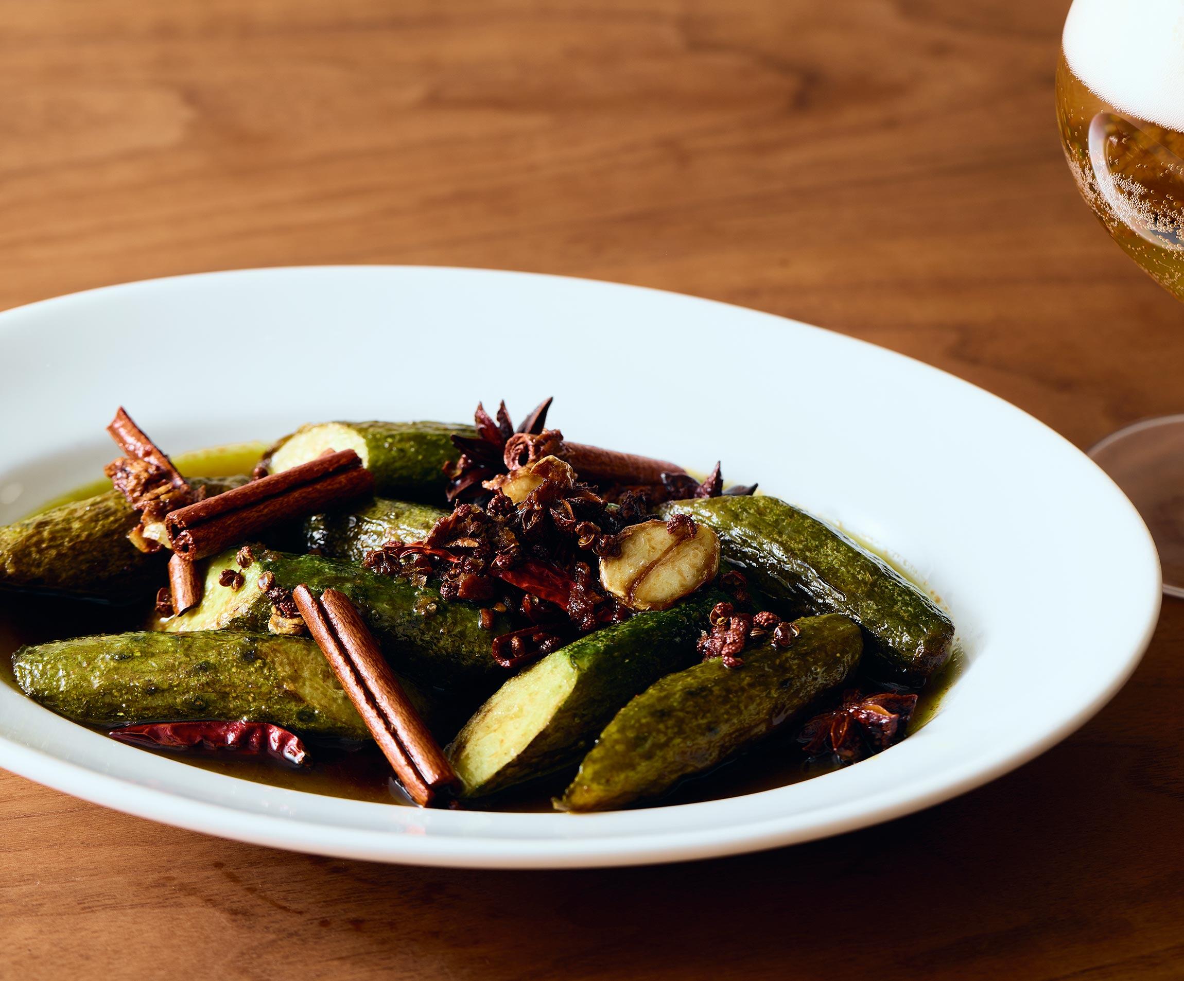 きゅうりの焼き目とごま油、刺激的な鷹の爪に甘やかなシナモン、オリエンタルな八角などの香りが渾然一体となって立ち上る。皿の上はもうアジア旅!