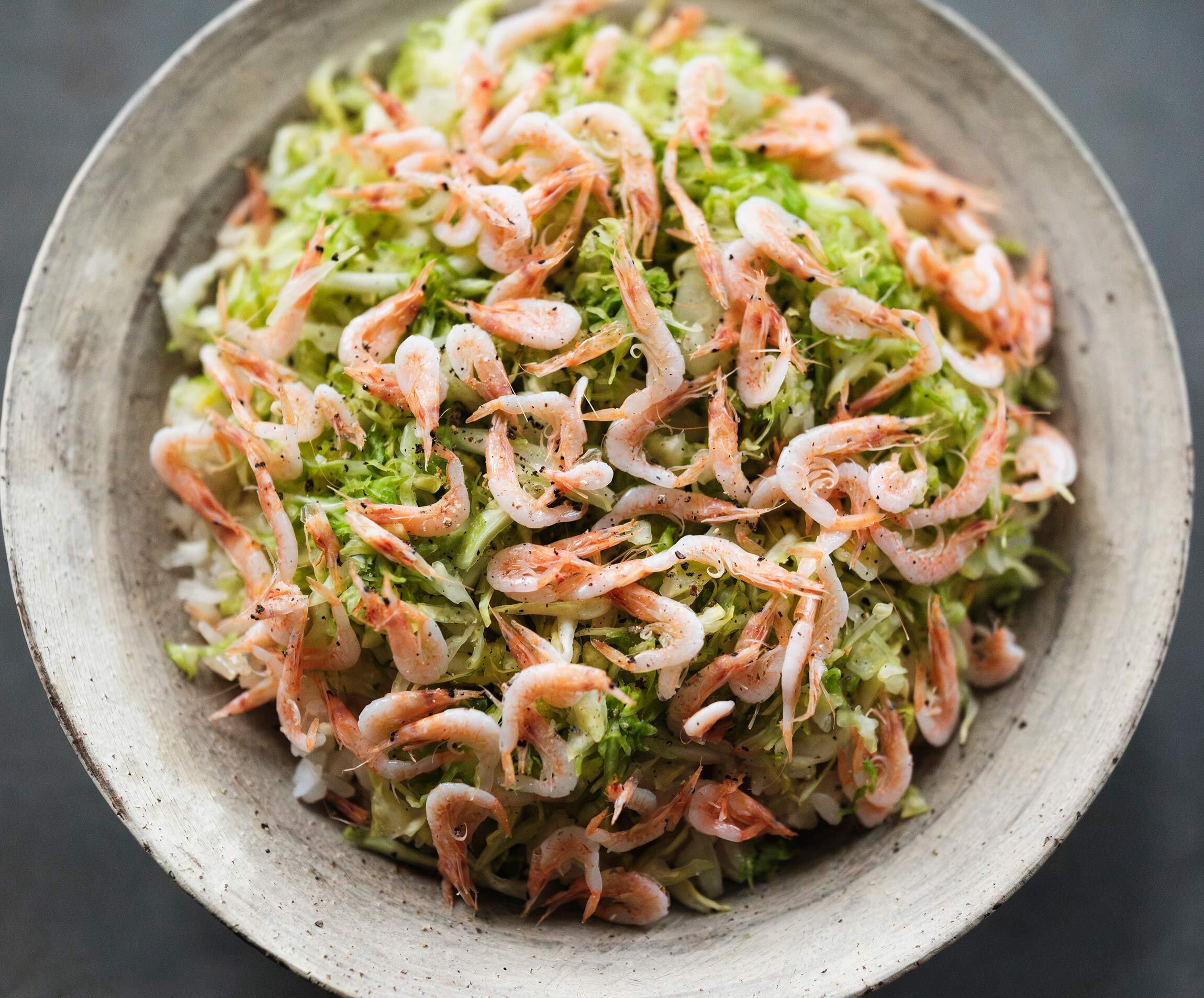 皿に寿司飯を広げ、キャベツを全体に広げるようにのせる。その上に桜海老をちらして、黒胡椒をやや多めに振りかける。好みでオリーブオイルを適量かける。