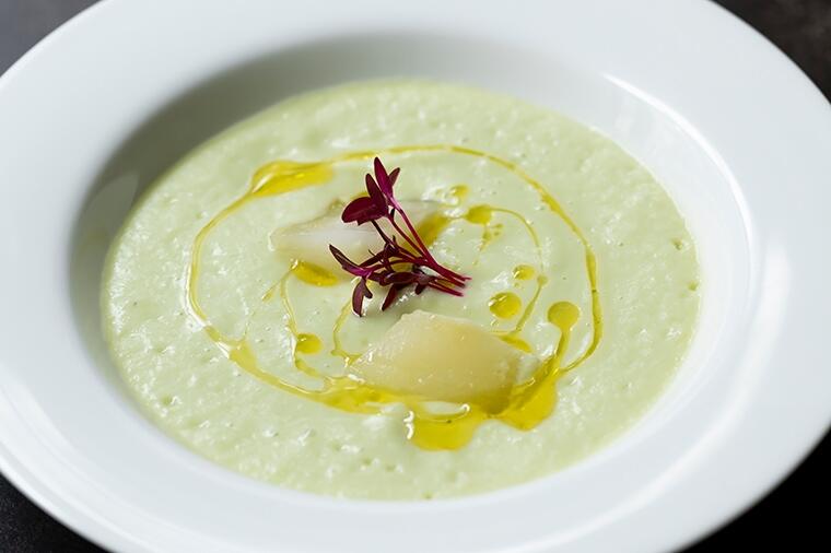 素材を敢えて粗くカットして、じゃがいもとともに野菜の存在感が際立つガスパチョに。落とした卵を崩しなが...