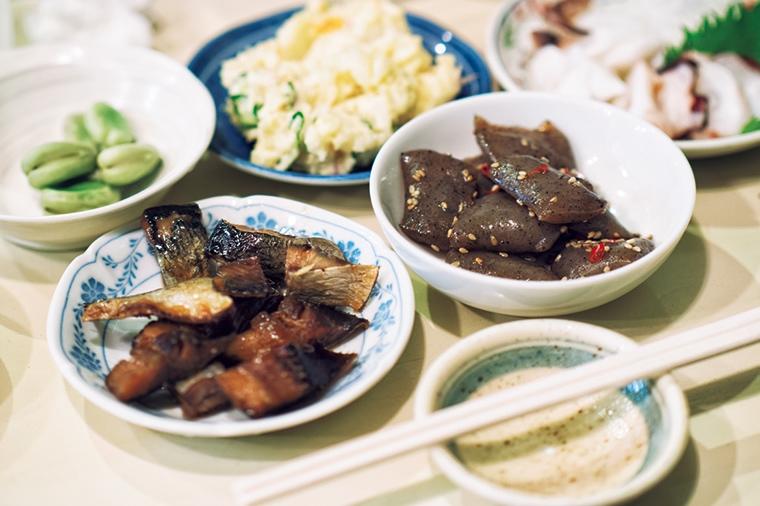 たっぷりの大根おろしをのせた鮪の赤身漬けに、子持ち鮎の甘酢漬け。ホタテの煮凝りに、皮までうまいサーモ...
