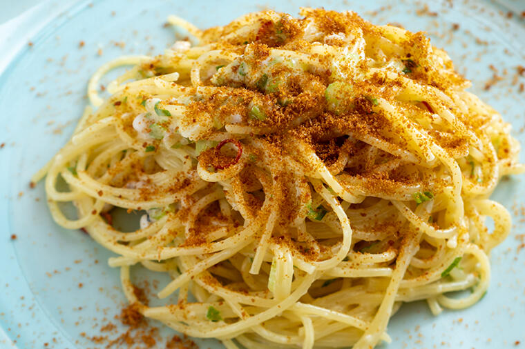 ゆでたキャベツの軽やかな食べ心地とからすみの旨味が美味しいパスタです。ランチにも食事の締めにもお薦め...