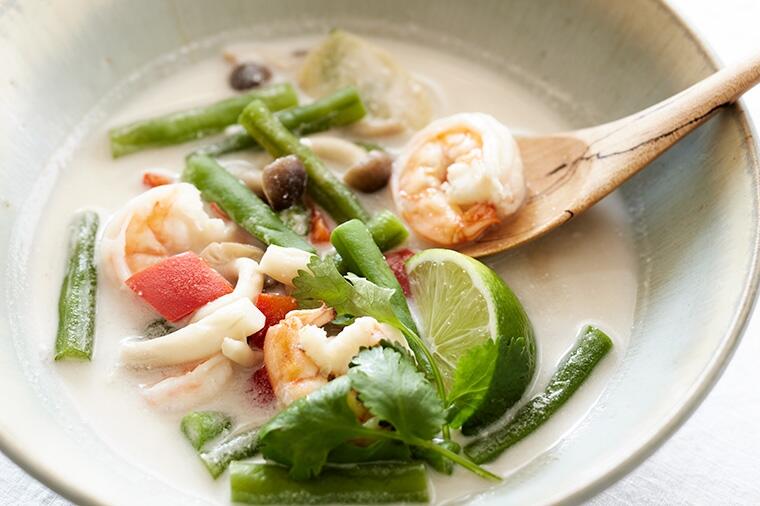 東南アジアを彷彿とさせる、温かなスープです。器に添えたライムを一搾りすると、香りと味わいがさっぱりに...