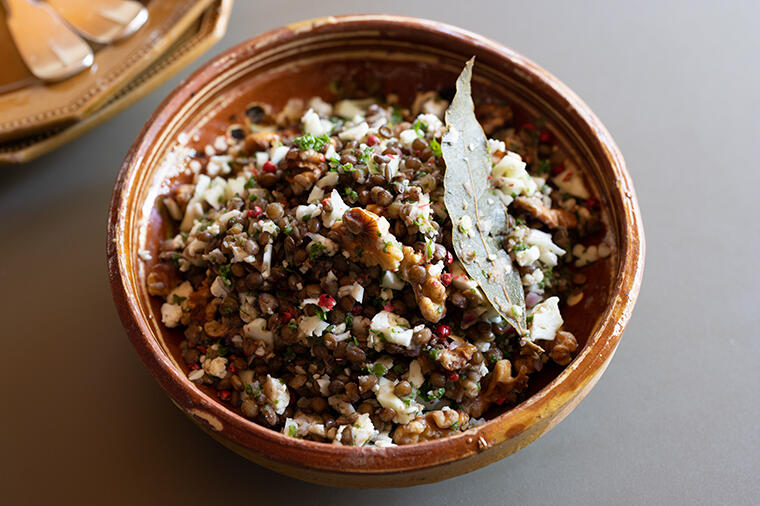 酸味が効いたレンズ豆のタブレ(冷たいサラダ)は、カリッとしたくるみの食感がアクセント。ピタパンに少し...