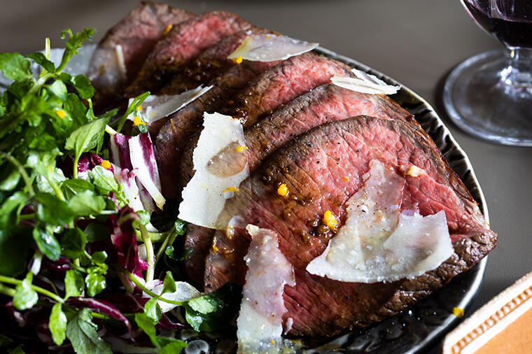 イタリア語で「牛肉を薄くスライスする」という意味のタリアータ。室温に戻した塊肉にオイルを少しずつかけ...