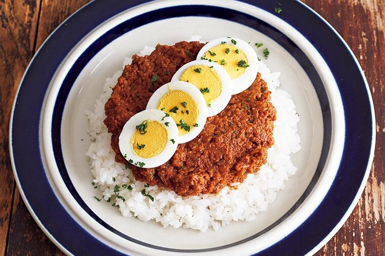 ドライカレーを牛の挽き肉だけでつくると、牛の脂でミルキーな風味に。ゆで卵を崩しながら食べるのがお薦め...