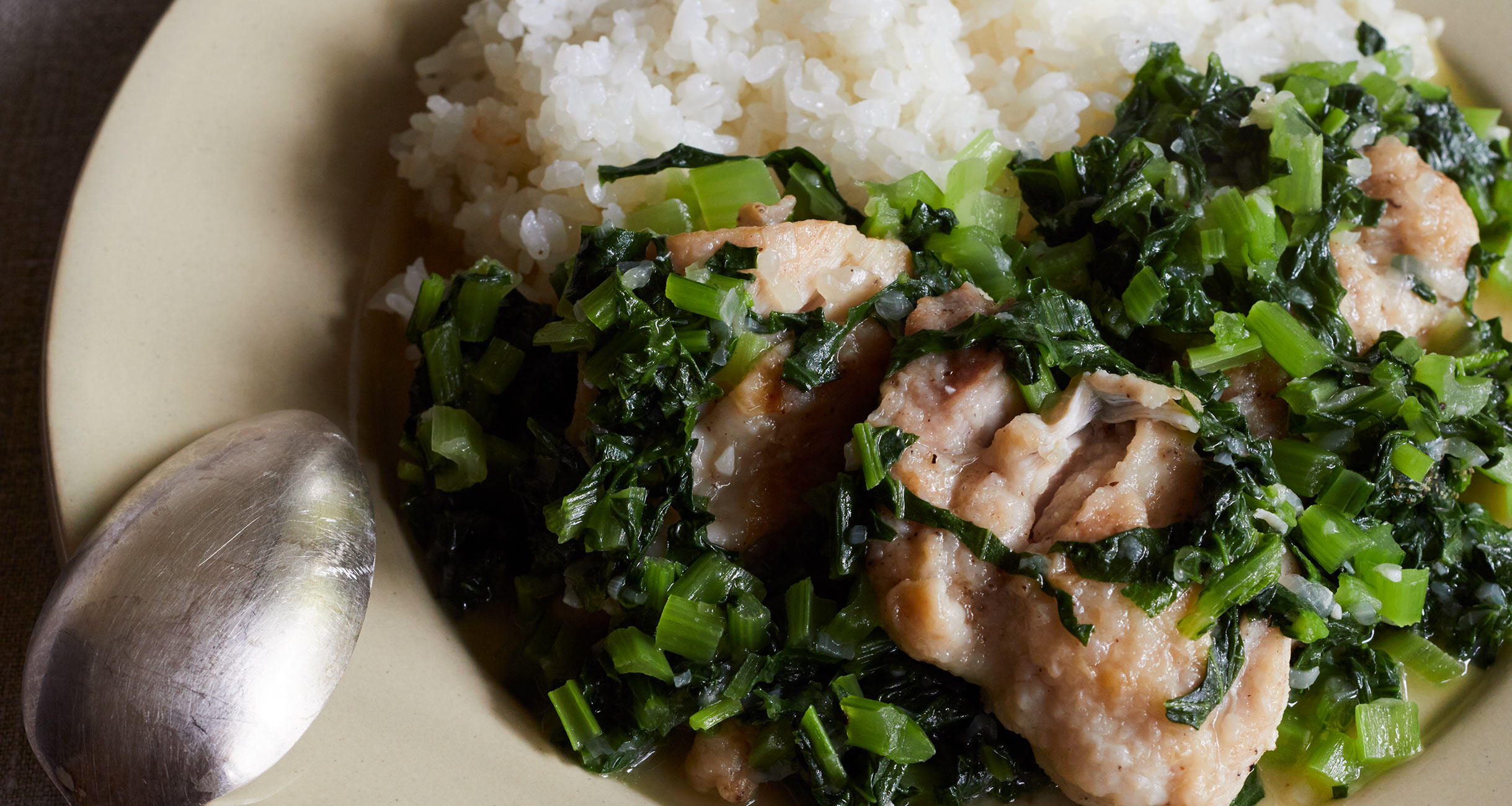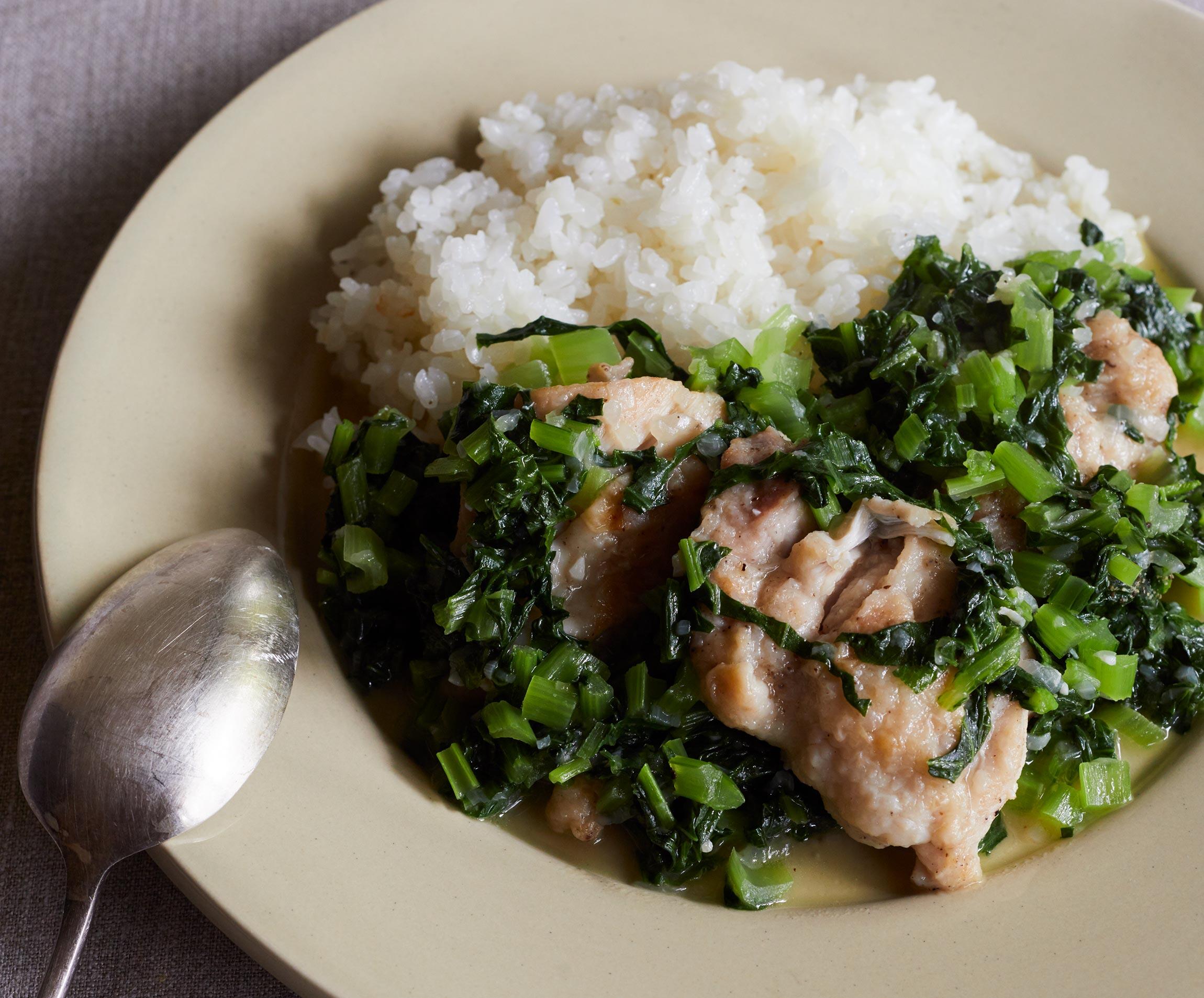 2023.01.17 季節の「引き算」料理 バターライスと相性抜群!"鶏肉と小松菜のスープ煮" 旨味の多いもも肉はひと手間かけて小麦粉をまぶしつけます。こんがり香ばしさとともにほんのりとろみもつい...