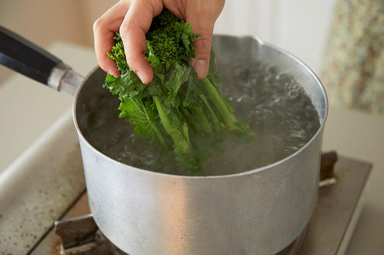 今の時期が旬の菜の花。ほろ苦い大人の風味がくせになる今しか味わえないおいしさです。